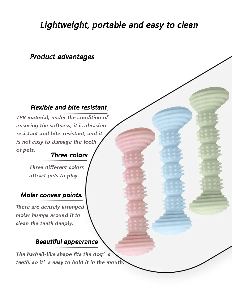 2. Мягкий материал: форма гантели, длинный стержень, как внешний вид, с использованием TPR материала, хорошая эластичность, устойчивость к укусам и стойкость к истиранию, домашние животные не легко повредить зубы во время игры.