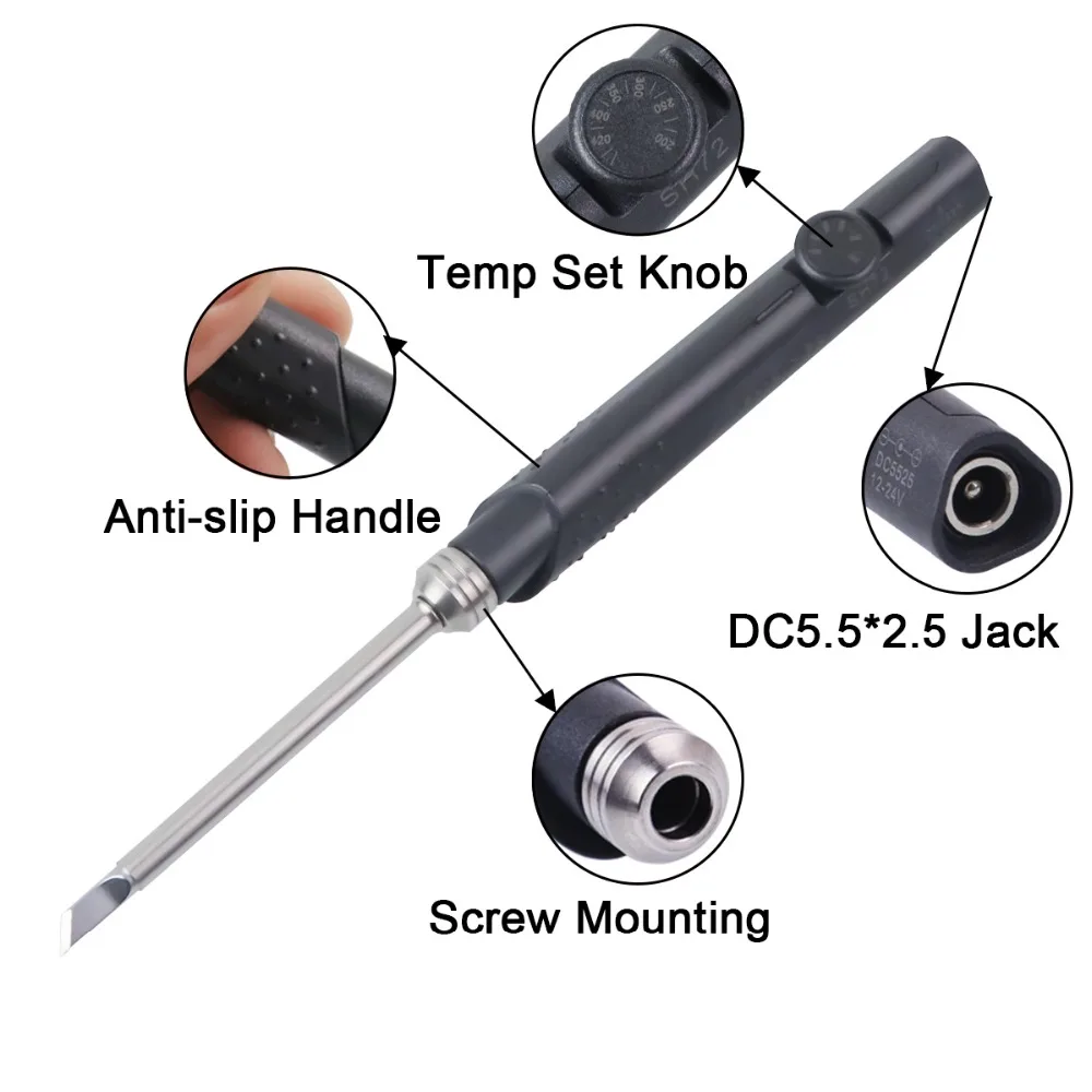 Это портативный Электрический паяльник с компактной формой ручки и подключаемым наконечником, устанавливающим дизайн whch, имеет длину 177 мм, удобную в использовании. Он имеет выход высокой мощности 65 Вт и быструю скорость нагрева, чтобы достичь установленной температуры всего за несколько секунд. 220-400 градусов Цельсия Регулируемый температурный диапазон с маркированной ручкой для регулирования простой в эксплуатации он оснащен DC5.5 * 2,5 разъемом питания с DC12V-24V входом низкого напряжения, который может питаться от литиевой батареи или ноутбука питания напрямую, безопасный и простой в использовании. Есть 7 типов наконечников для паяльника, которые могут быть выбраны для удовлетворения ваших различных ремонтных работ.
