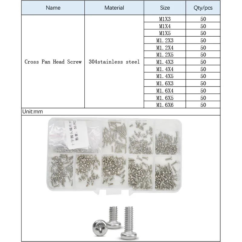 2. Спецификация:Тип винтов:Филлипс головкой self-винт стукРазмер: M1 M1.2 M1.4 M1.7Материал: нержавеющая сталь 304Посылка: 600 шт. винтов