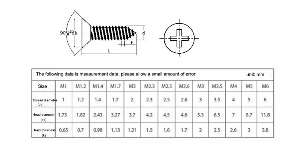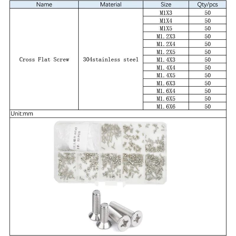 4. Спецификация:Тип винтов:Крест Phillips плоский потайной болт с головкойРазмер: M1 M1.2 M1.4 M1.6Материал: нержавеющая сталь 304Посылка: 650 шт.