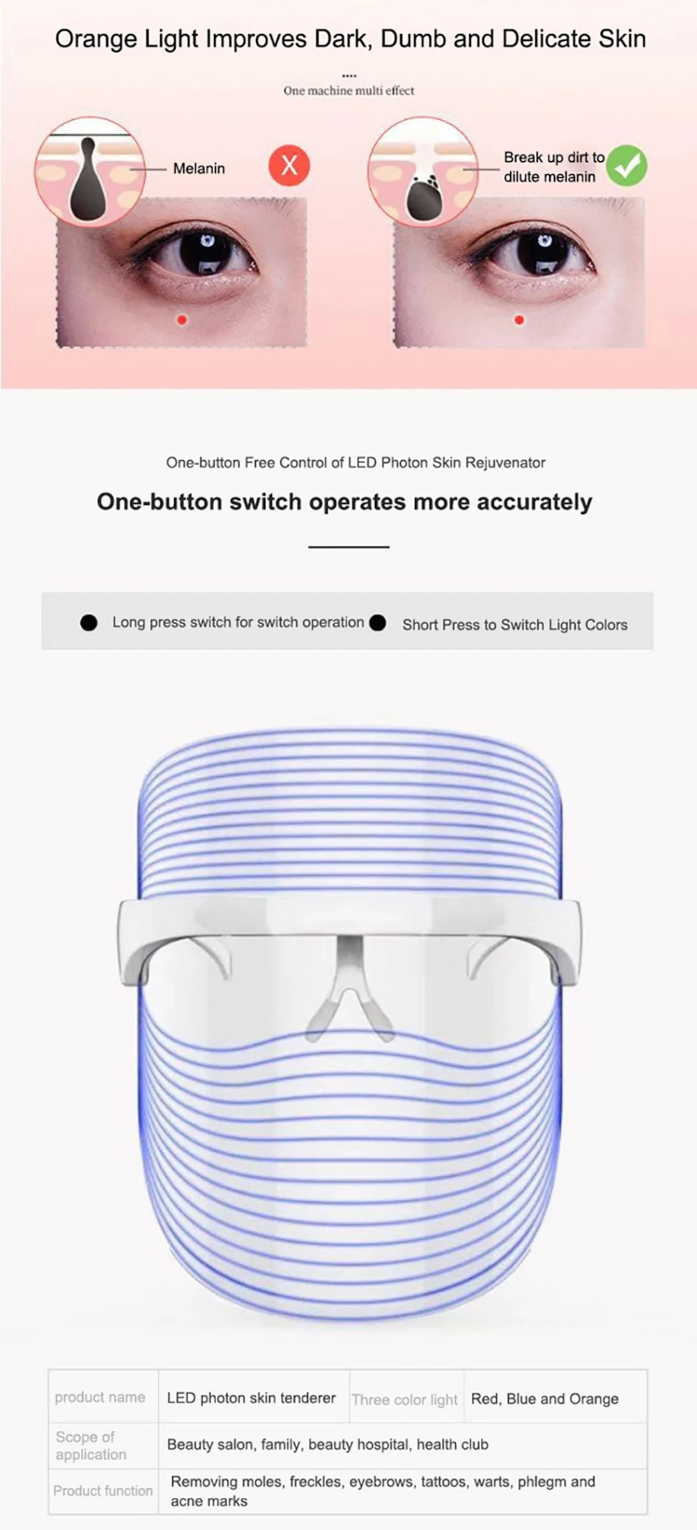 1. Красный светильник: 620 ~ 750 нм. Повышает эластичность кожи и улучшает обмен веществ.