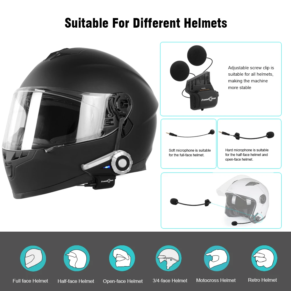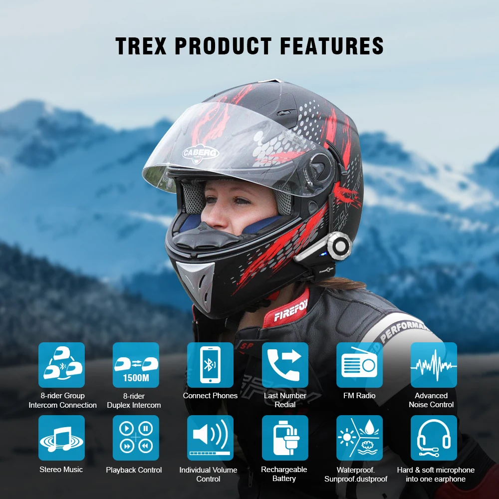 Благодарим Вас за выбор FreedConn T-Rex мотоциклетная Bluetooth система связи.T-Rex-это полнодуплексная система Bluetooth для групповых разговоров, применяющая гуманизированный дизайн, интегрирующая передовую технологию всех аналогичных продуктов и превращающаяся в идеальную моторную систему связи. Он может отслеживать все виды потребностей в вашем путешествии, такие как беспроводной набор, прием звонков, прослушивание музыки в формате MP3, получение голосовой подсказки GPS и подключение к ручному телефону. Самое главное, что он может воплотить групповую беседу среди мотоциклов, обеспечивая вам удобную связь с вашими партнерами по команде во время езды.