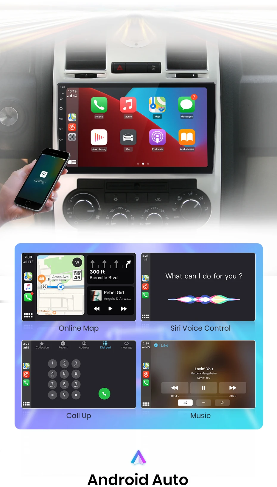 > Просто подключите ваш телефон, что позволит вам получить доступ к навигационной карте, телефонным контактам, уведомлению, прослушиванию музыки и многому другому. Вы можете пробуждать Siri помочь получить доступ к этим функциям, таким образом, вы можете не только уменьшить скучное время вождения, но и значительно увеличить удовольствие от вождения.
