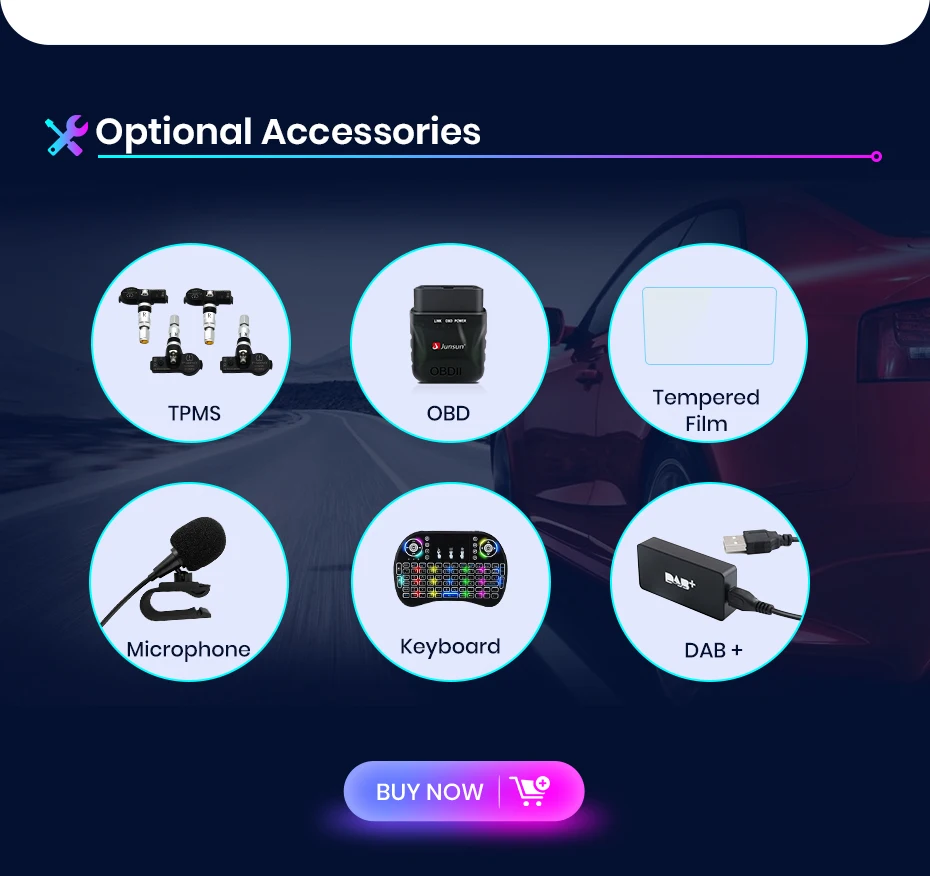 2. AHD задняя камера, ADAS DVR, Мониторинг давления в шинах, OBD2, внешний микрофон, RCA кабель, DAB +;
