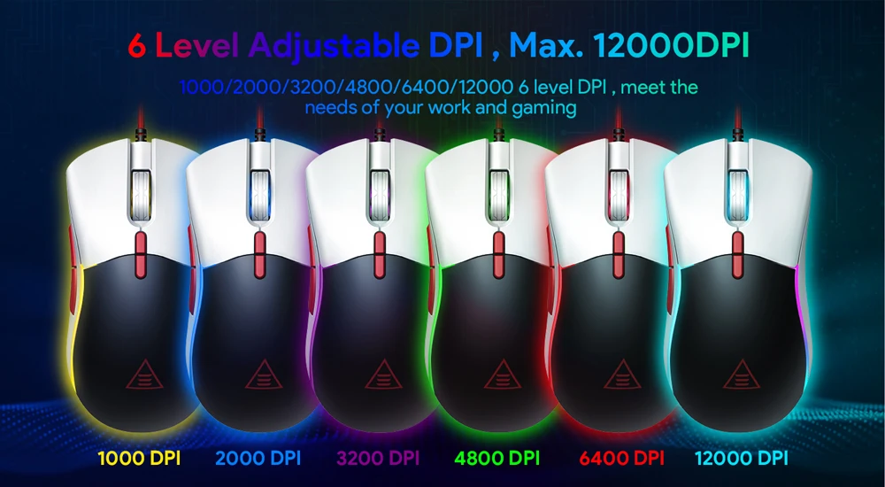 Есть 6 Регулируемых уровней DPI (1000/2000/3200/4800/6400/12000). Благодаря передовому сенсору 825F эта компьютерная мышь обеспечит максимальную точность и отклик игр, и она не потеряет треки на любом уровне DPI.