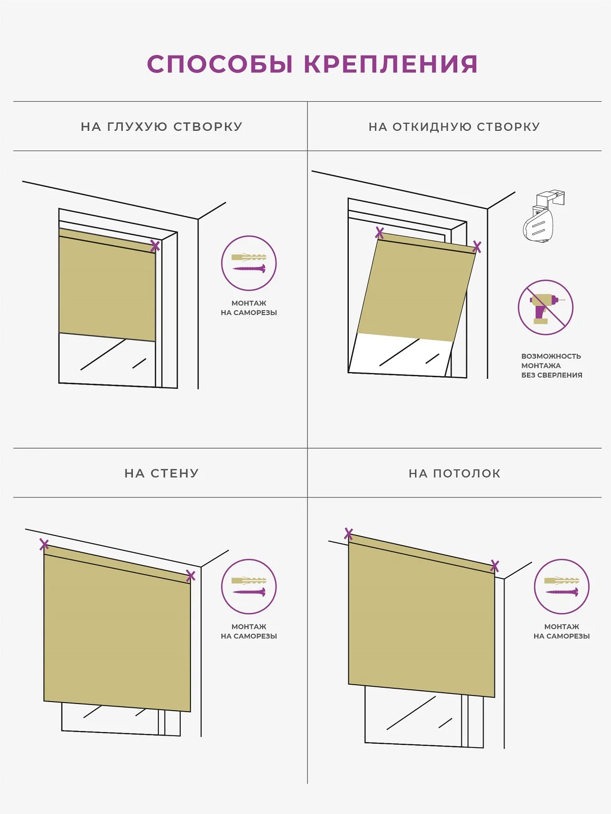 Универсальная конструкция позволяет крепить штору на раму без сверления, также можно монтировать на стену, потолок, створки, в проем, ниши, на деревянные или пластиковые рамы.
