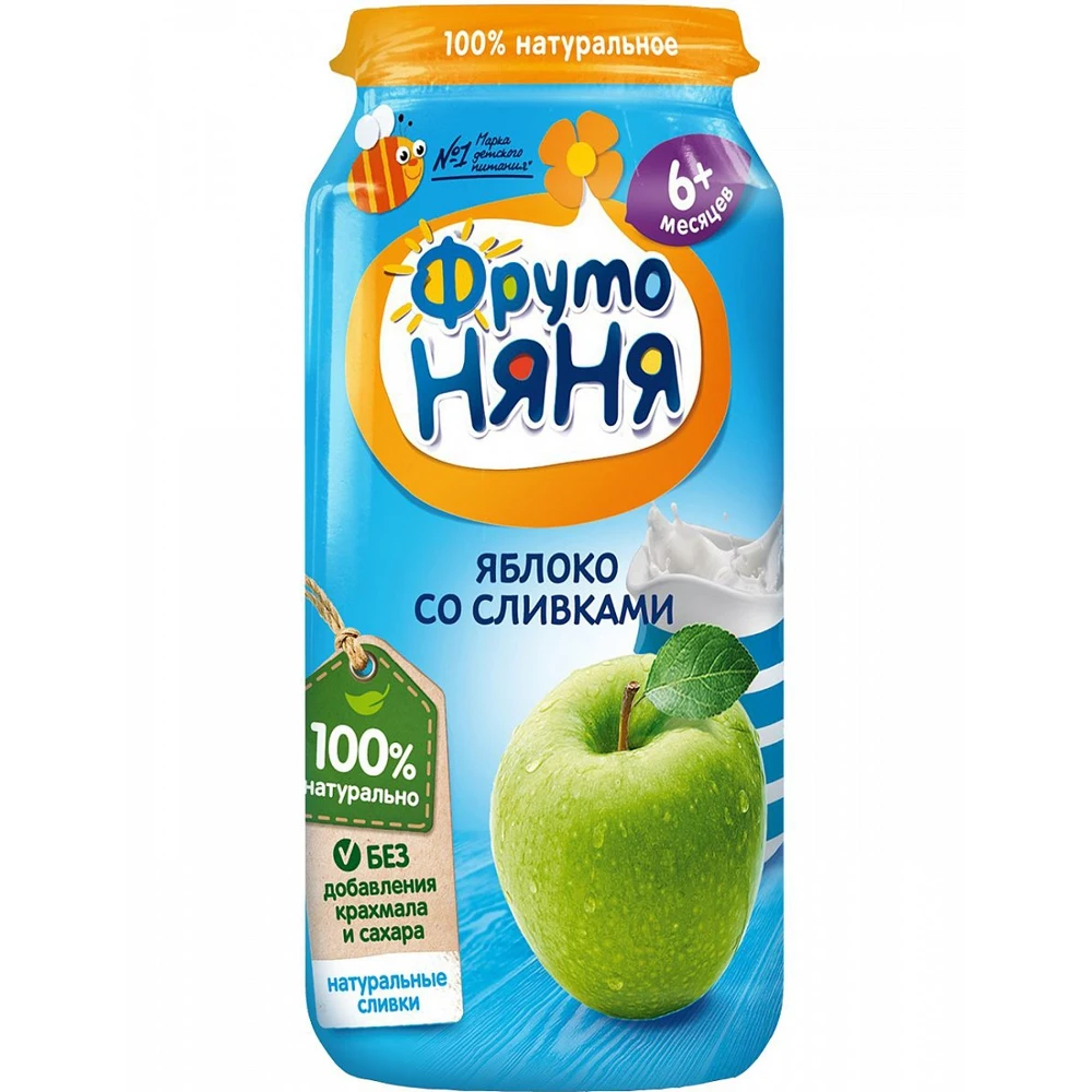 Пюре ФрутоНяня из яблок со сливками с 6 мес. 250 г. Яблоко богато пектином и природными сахарами. В яблоке содержится железо, и витамин С. Сливки придают пюре очень нежный вкус. Они богаты жирорастворимыми витаминами, особенно витамином А, железом и содержат большое количество легкоусвояемого молочного жира.