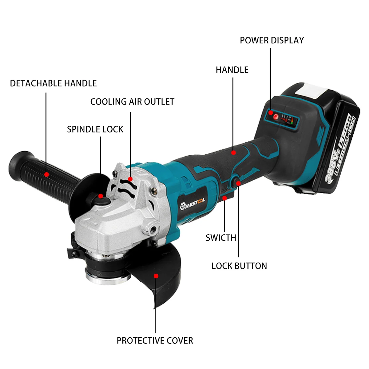 Угловая шлифовальная машина Светильник с индикатором зарядки с 3 передачами Металлический корпус шестерни прочный и имеет более длительный срок службы. 3-положение резиновая вспомогательная ручка подходит для левой руки или правой рукой. Быстрая установка и замена аксессуаров через Шпиндельный замок, так что вы можете работать более безопасно и быстрее. Резиновая Противоударная ручка легко удерживается и используется для длительного использования. Защита от инструментов для быстрой и легкой регулировки. Шпиндельный замок, может быстро и легко менять колеса. Тонкий крой, удобный захват.