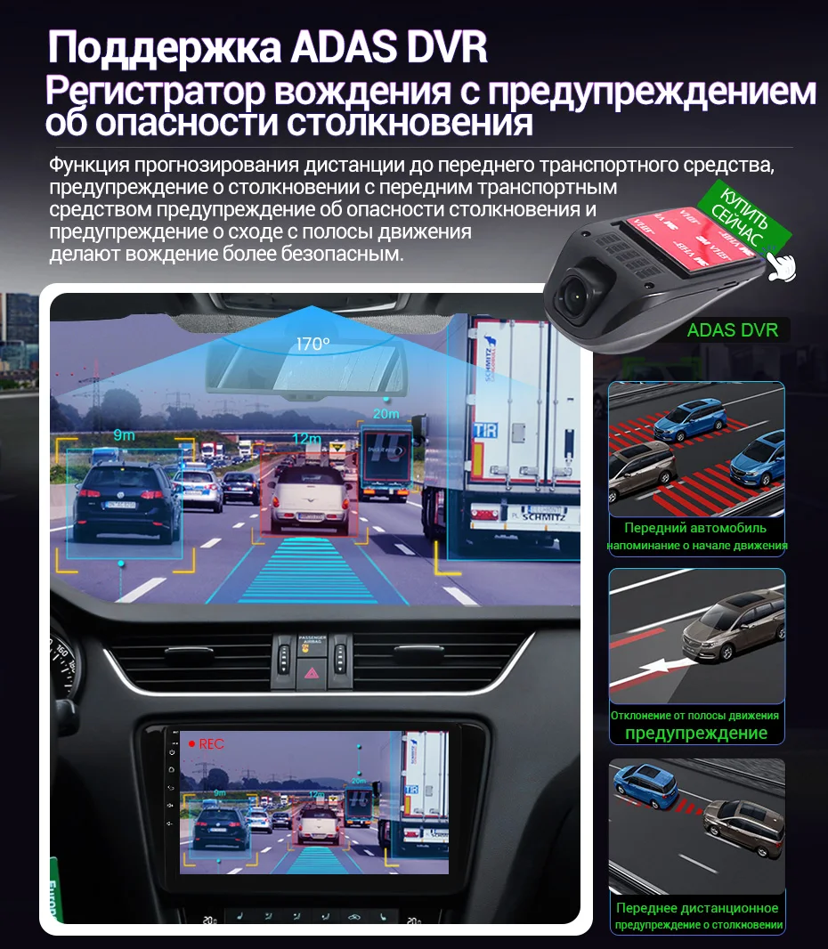 > Поддержка видеорегистратора ADAS с защитой от столкновенийВо время вождения, обнаружено, что автомобиль находится слишком близко к переднему автомобилю или автомобиль будет отклоняться от полосы движения и издаст сигнал раннего предупреждения, чтобы уменьшить вероятность дорожно-транспортных происшествий и сделать вождение более безопасным.При необходимости, пожалуйста, нажмите на картинку, чтобы купить