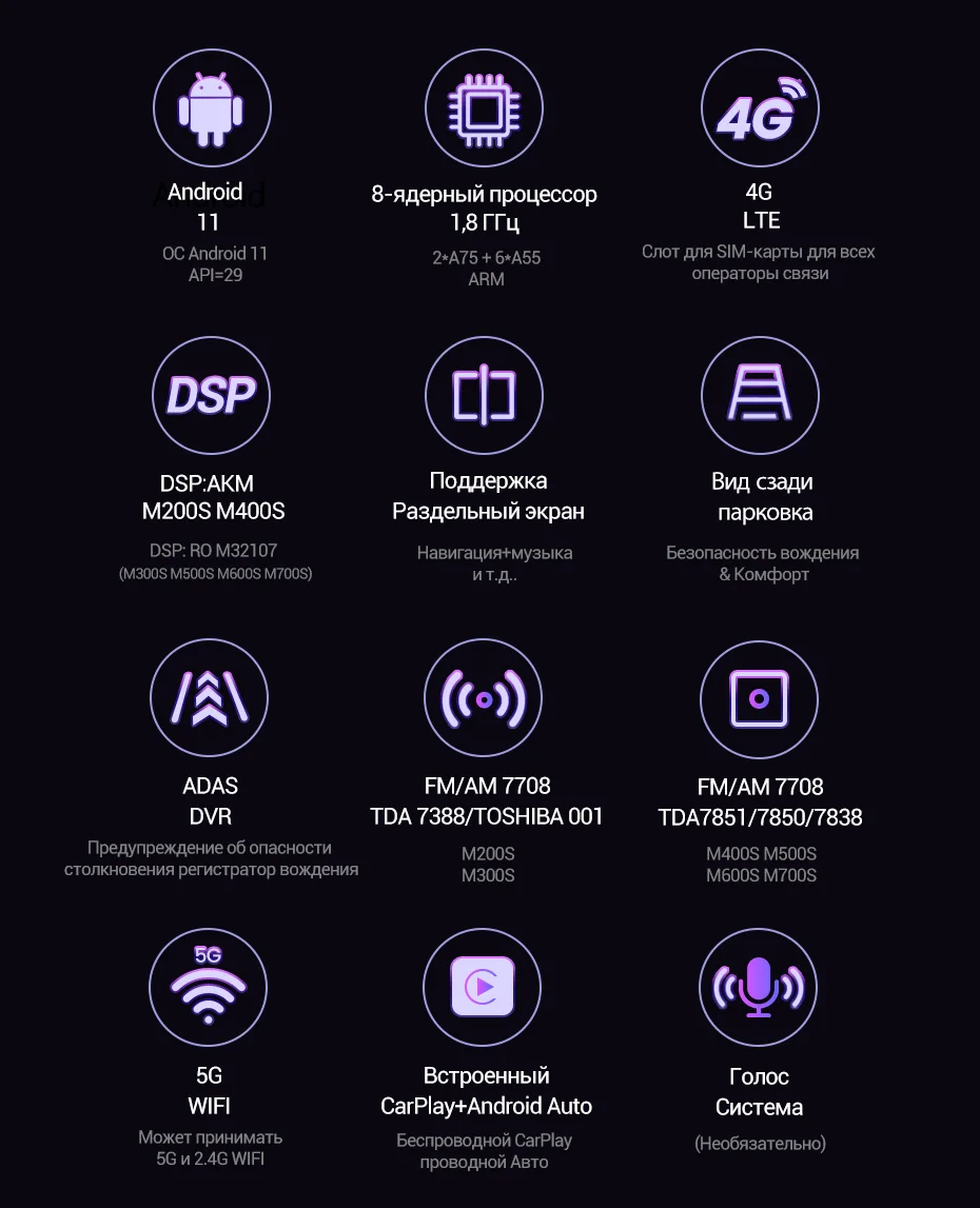> Поддержка 4G LTE(M200S M300S M400S M500S M600S M700S)Подключайтесь к 4G, вы можете смотреть в режиме реального времени, слушать музыку онлайн, играть в игры, смотреть фильмы и легко подключать ваш автомобиль к Интернету в любое время.