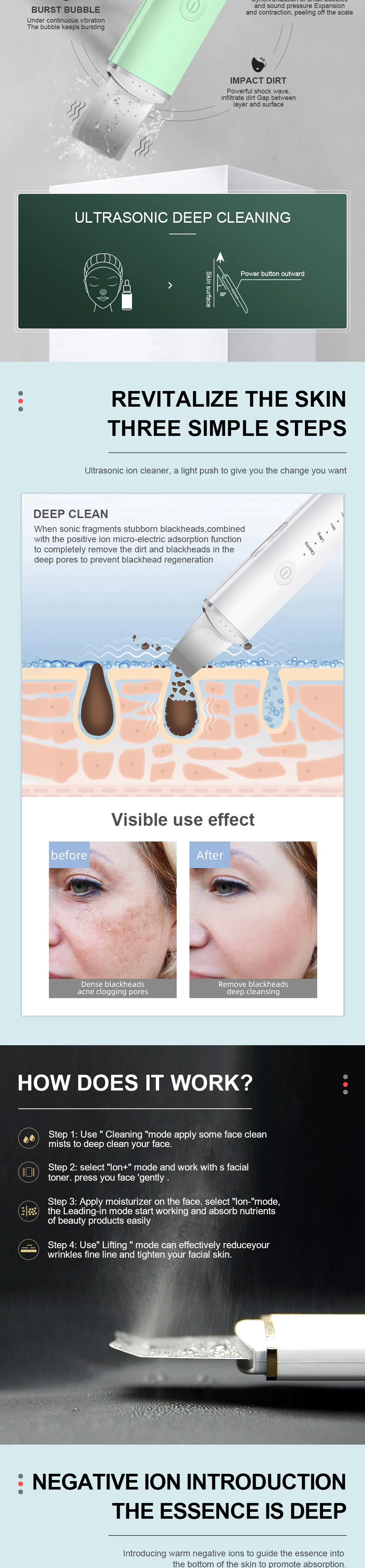 1. Для ускорения метаболизма клеток эпидермических клеток и повышения их нормального уровня, для глубокого очищения используется способ работы с углом 45 градусов, что повышает выпадение пожилых и нерегулярных аберрантных клеток, смягчайте кератин, повторно закажите эпидермические клетки, восстановив эластичность кожи и обратившись к твердой, гладкой и нежной коже. 2. Лидирующий в питании и активации кожи путем принятия ультразвуковой вибрации и тепидного эффекта, он может способствовать циркуляции крови внутри дермы, ускоряет лимфатический возврат, токсин разряда, который накапливается в более глубокой коже и устраняет мертвые клетки, чтобы избежать чрезмерного скопления клеток корнеозного слоя, таким образом, чтобы вода и питание быстро переносились, Улучшает проницаемость клеток, укрепляет уход за кожей, улучшает увлажнение кожи.
