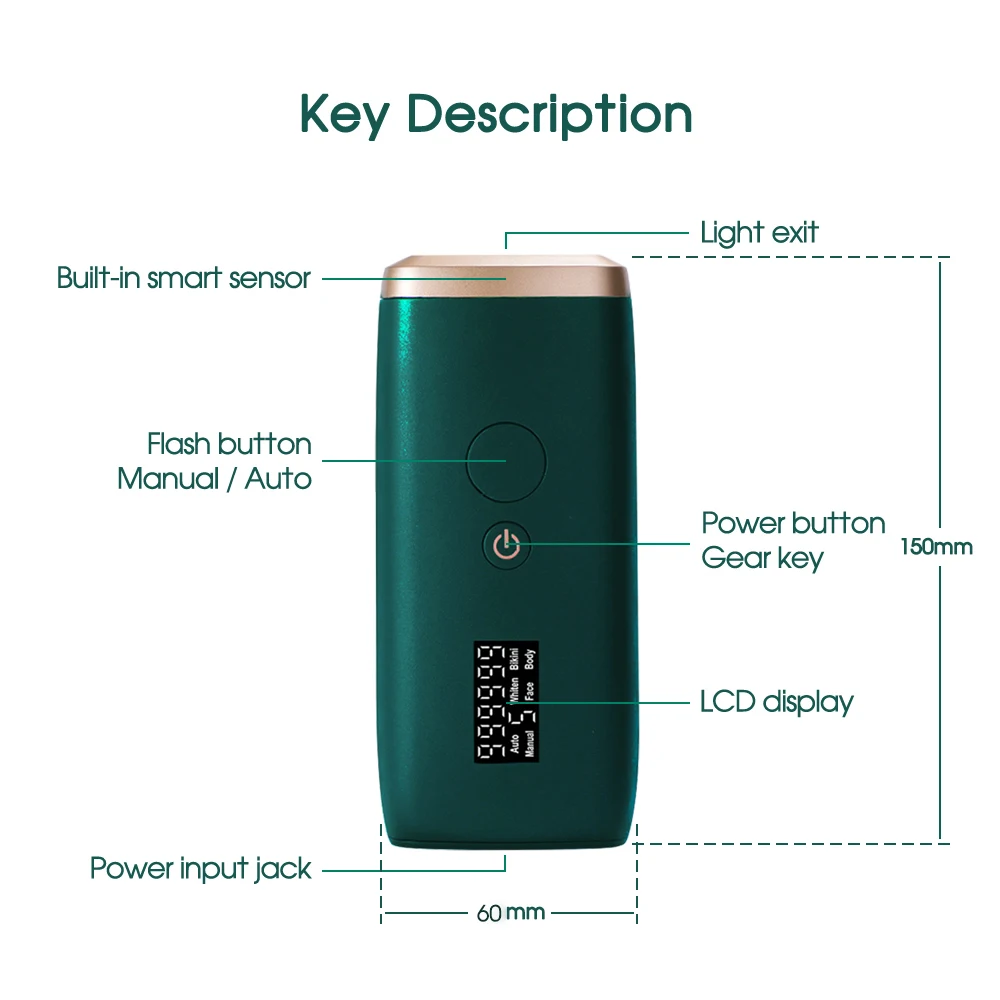 ● Автоматический режим подходит для больших лечебных зон, таких как ноги, спина, руки; Ручной режим используется для чувствительных или небольших областей, таких как Линия бикини, верхняя губа и подмышки.