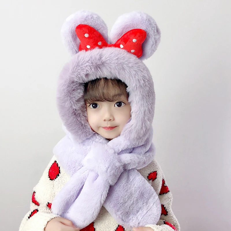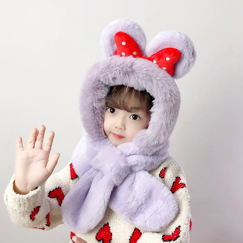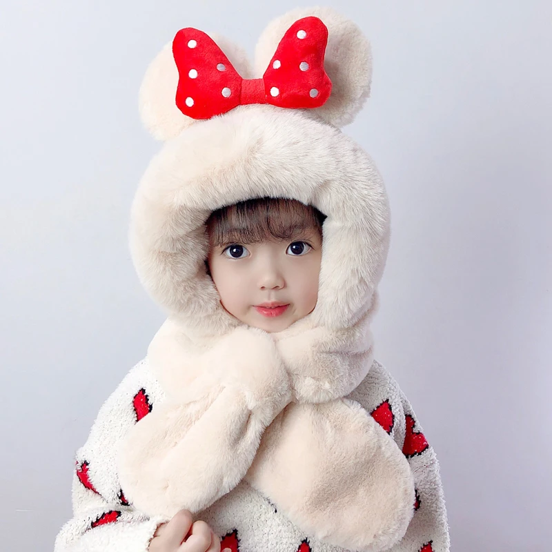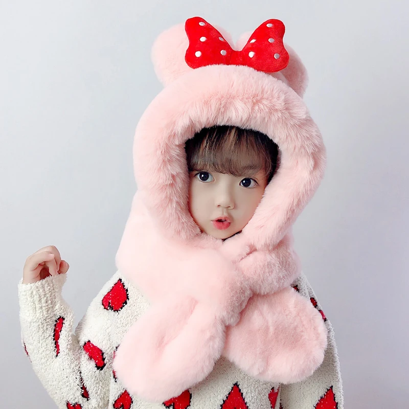 Doitbest/детские зимние шапки с большим бантом, комплект шапок, Детская меховая шапка с ворсом, шарф, цельнокроеные шапки с ушками для мальчиков и девочек