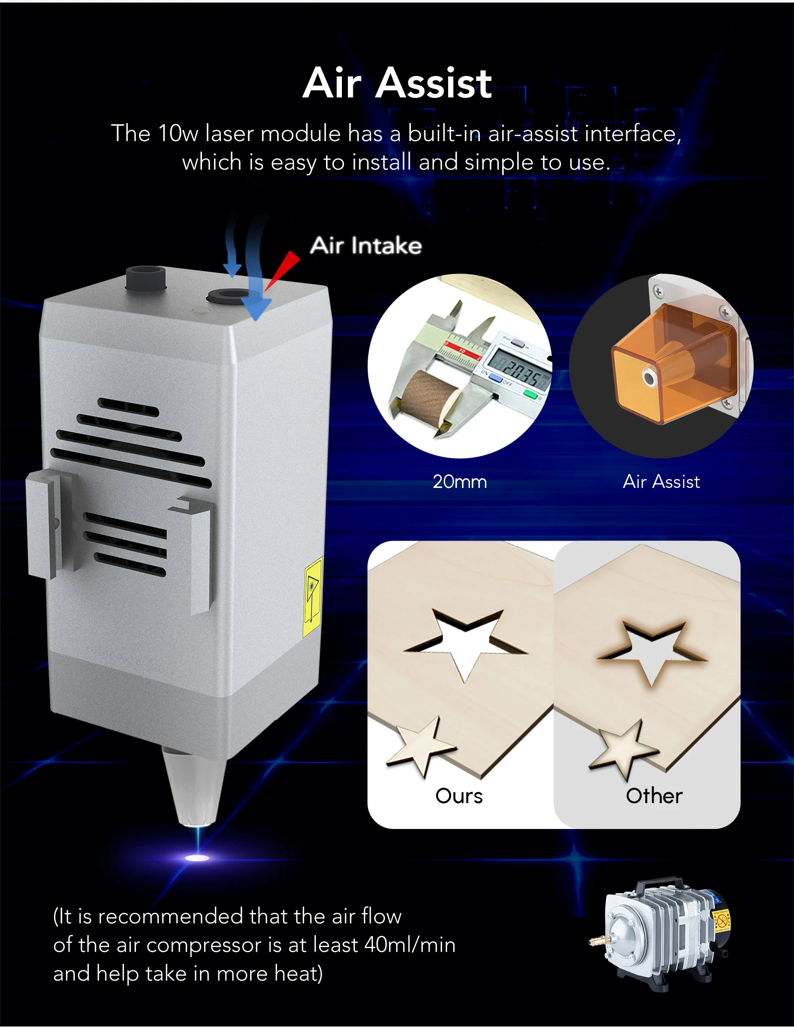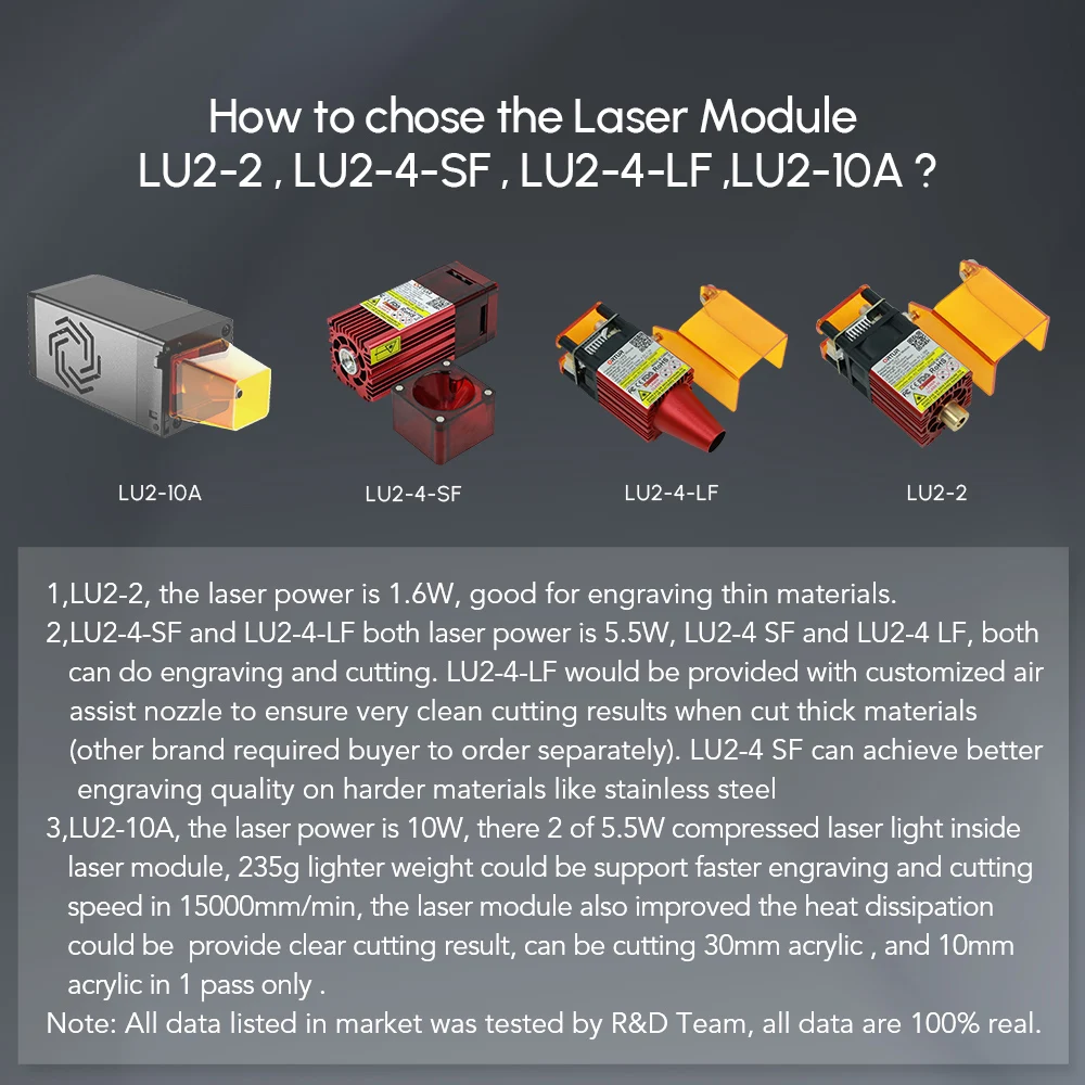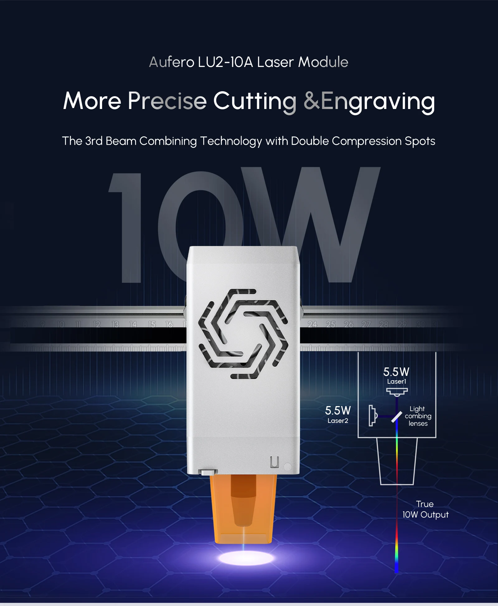 LU2-4-SF лазерный модуль с коротким фокусом лазерного гравера Aufero имеет реальную световую мощность 4500-5500 МВт и фокусное расстояние 0,12x0,15 мм. С высокой мощностью сжатого пятна, он хорошо режет и лучше гравирует жесткие материалы. LU2-2 лазерный модуль с фиксированным фокусом лазерного гравера Aufero имеет реальную световую мощность 1000-1600 МВт и фокусное расстояние 0,07x0,06 мм, идеально подходит для гравировки высокоточных узоров. Примечание: модуль может работать с воздушным компрессором (не входит в посылка) для повышения производительности. Aufero рекомендует источник воздуха с потоком> 40 мл/мин. LU2-4-LF лазерный модуль с длинным фокусом лазерного гравера Aufero имеет реальную световую мощность 4500-5500 МВт и фокусное расстояние 0,17x0,25 мм. С высокой мощностью и большой глубиной поля, это хорошо подходит для гравировки и резки. LU2-10A: резка фанеры толщиной 8-10 мм по одному проходу со скоростью 1,5 мм/с. Более мощная гравировка с истинной выходной мощностью 10 Вт-Aufero LU2-10A обновлена с лазерным модулем 10 Вт, что делает скорость резки до 15000 мм/мин. Сжатая точка составляет 0,05 мм x 0,1 мм. Оптическая мощность достигает 10 Вт. Он может отрезать 30 мм акрил и 20 мм дерево. В то же время, лазерный модуль гравировального Станка имеет встроенный воздушный вспомогательный интерфейс, который предназначен для резки.