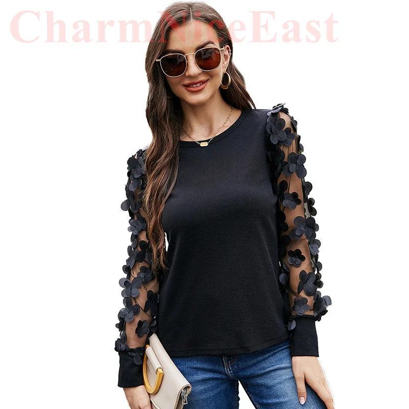 Женская элегантная сетчатая Лоскутная Блузка с длинным рукавом, Черная кружевная прозрачная блузка с цветочным рисунком, пуловер с рукавами-фонариками, уличная одежда, рубашки