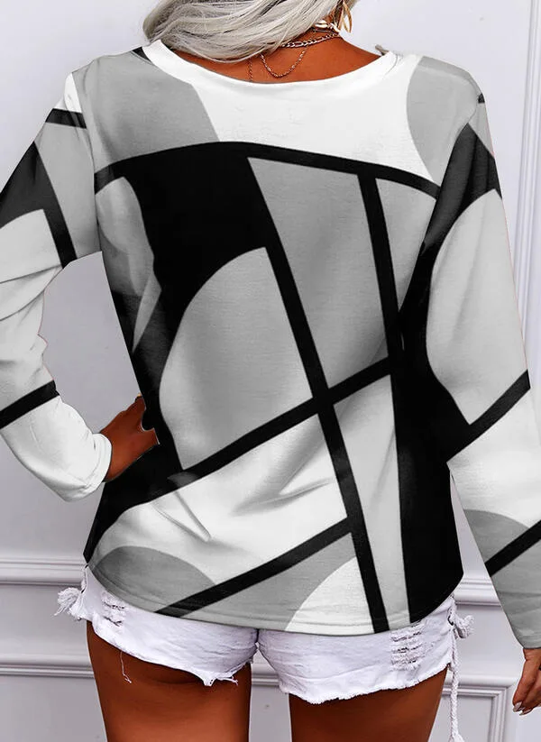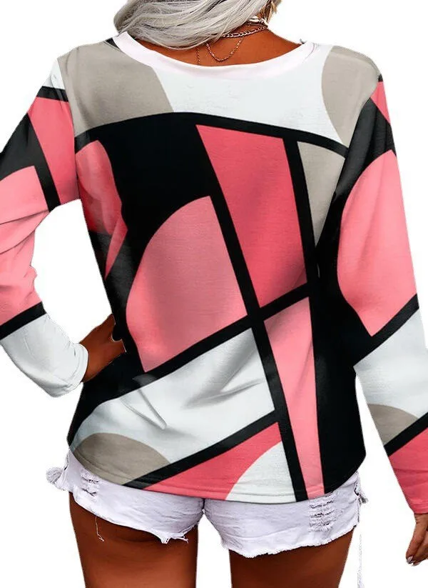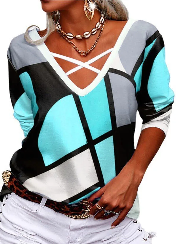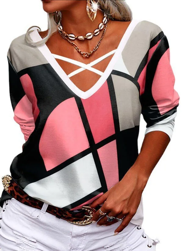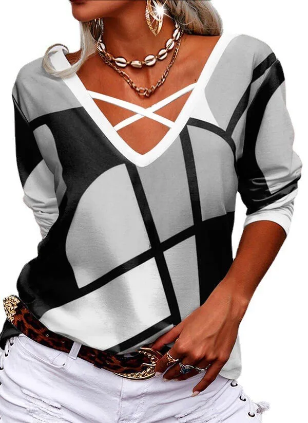Modname = ckeditorЖенская футболка с геометрическим принтом и v-образным вырезом на осень и зиму, повседневные топы с длинными рукавами, свободный пуловер размера плюс, базовая рубашка