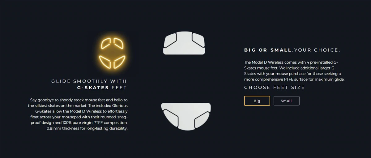 The Model D Wireless comes with 4 pre-installed G-Skates mouse feet. We include additional larger G-Skates with your mouse purchase for those seeking a more comprehensive PTFE surface for maximum glide.