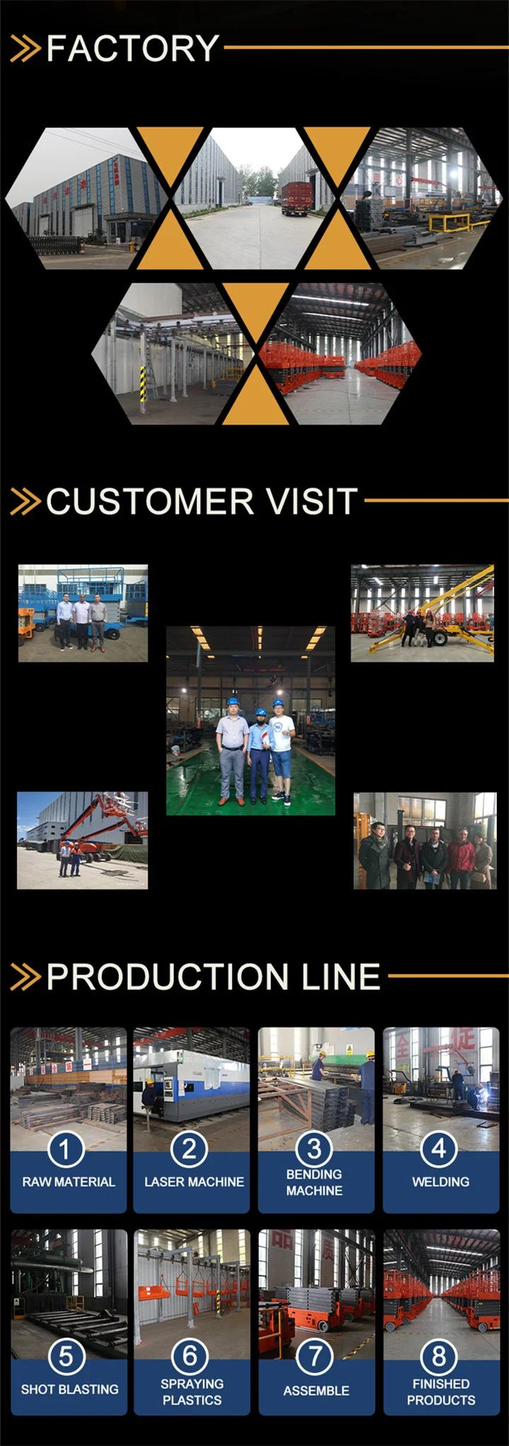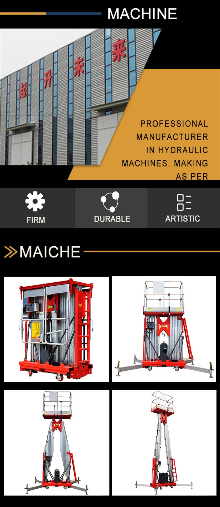 Высококачественная Алюминиевая Рабочая платформаОснащен четырьмя высокопрочными опорными ножками, оператор должен открыть четыре опорные ножки и настроить, чтобы быть на уровне в соответствии с градиентом. Для улучшения маневренности два набора пультов управления оснащены на воздушной рабочей платформе. Один находится на нижней стороне тела, а другой на платформе. Чехол для выключения питания, подъемная платформа из алюминиевого сплава для работы с человеком разработан с помощью кнопки аварийного отключения. Когда он выключится, закрутите аварийную кнопку, она начнет спускаться вниз.