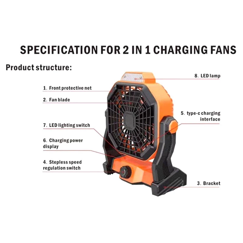 [Function]Using brushless motor, lightweight PC fan blade, with super strong wind force. The wind speed adopts the infinite wind speed, which can be switched arbitrarily. At the same time, there are three gears of LED lights. The lighting is used in conjunction with a built-in large-capacity 18650 battery.