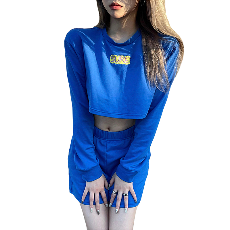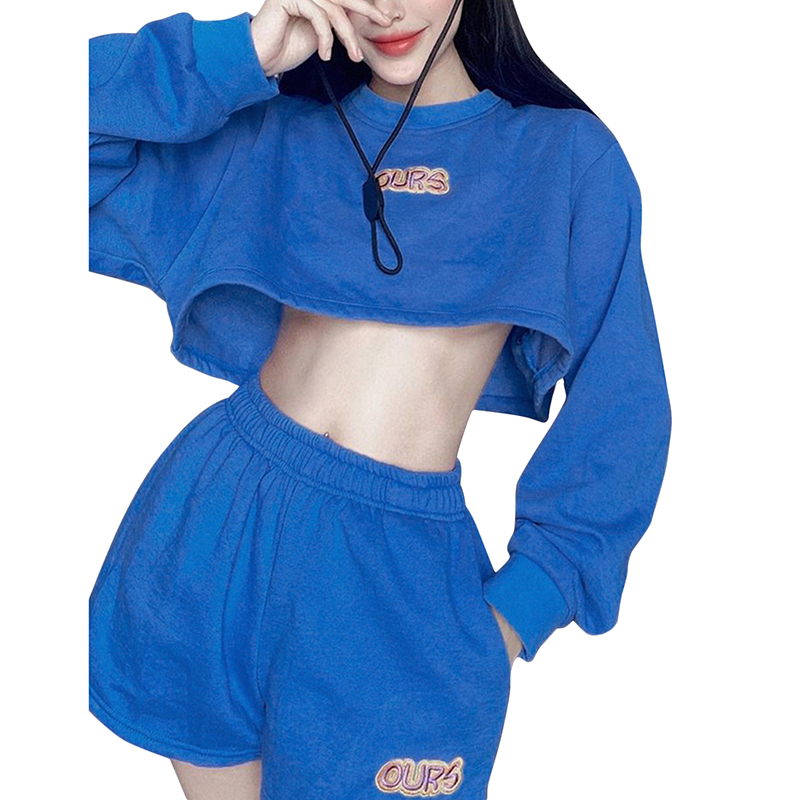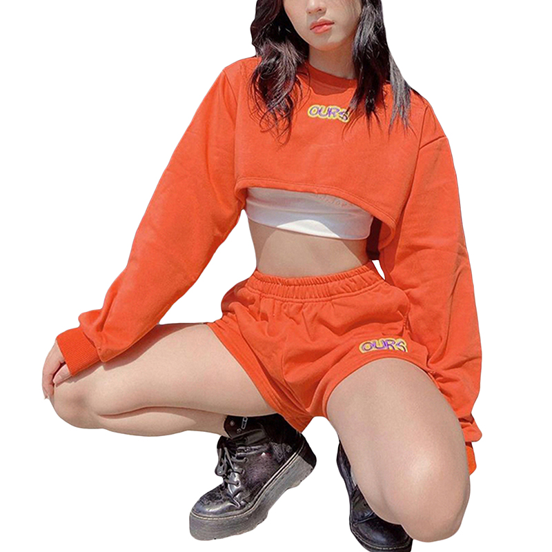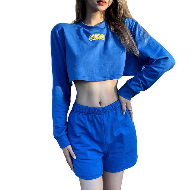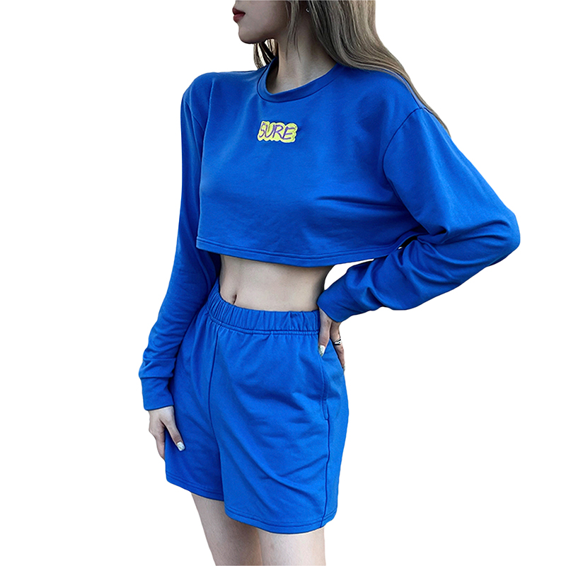 2Pcs Women Summer Tracksuit, Embroidery Long Sleeve Sweatshirt Matching Elastic Waist Shorts