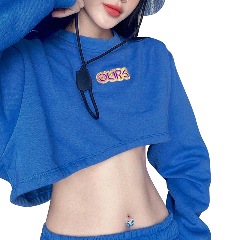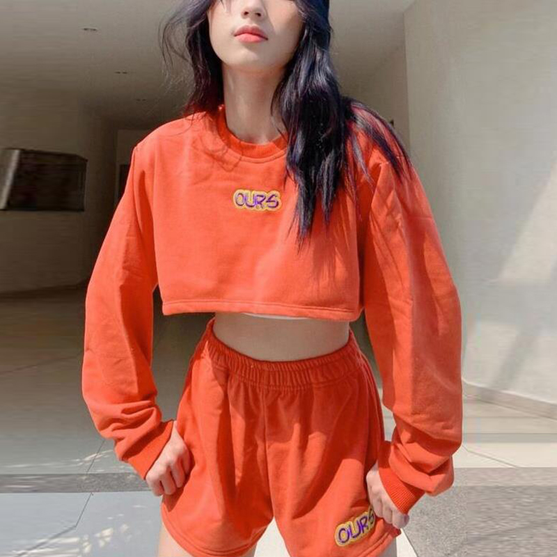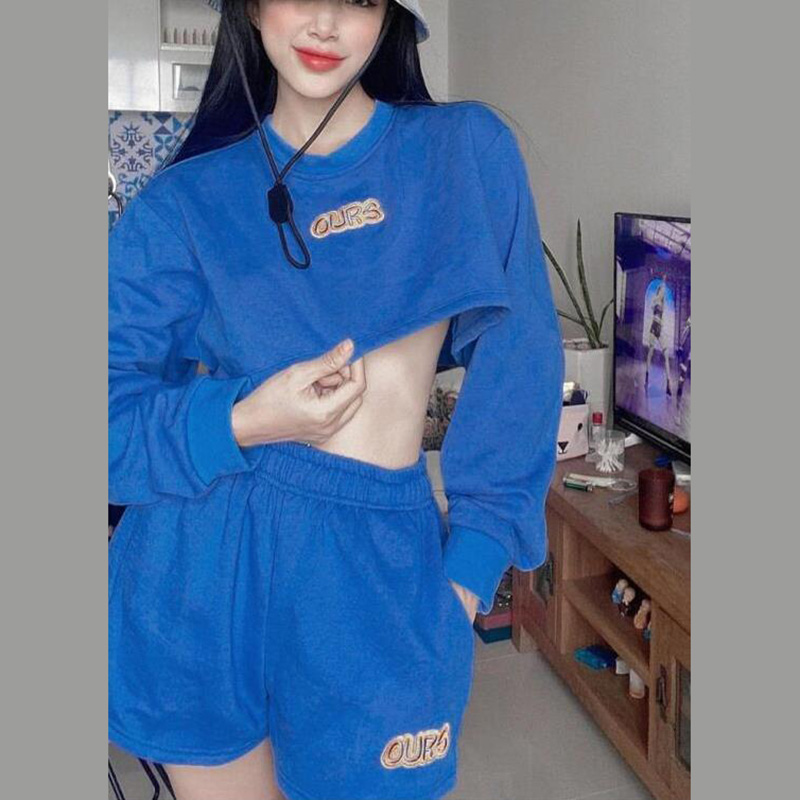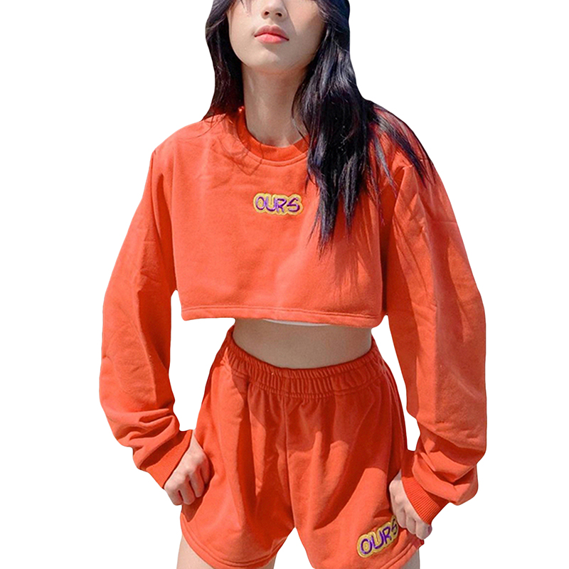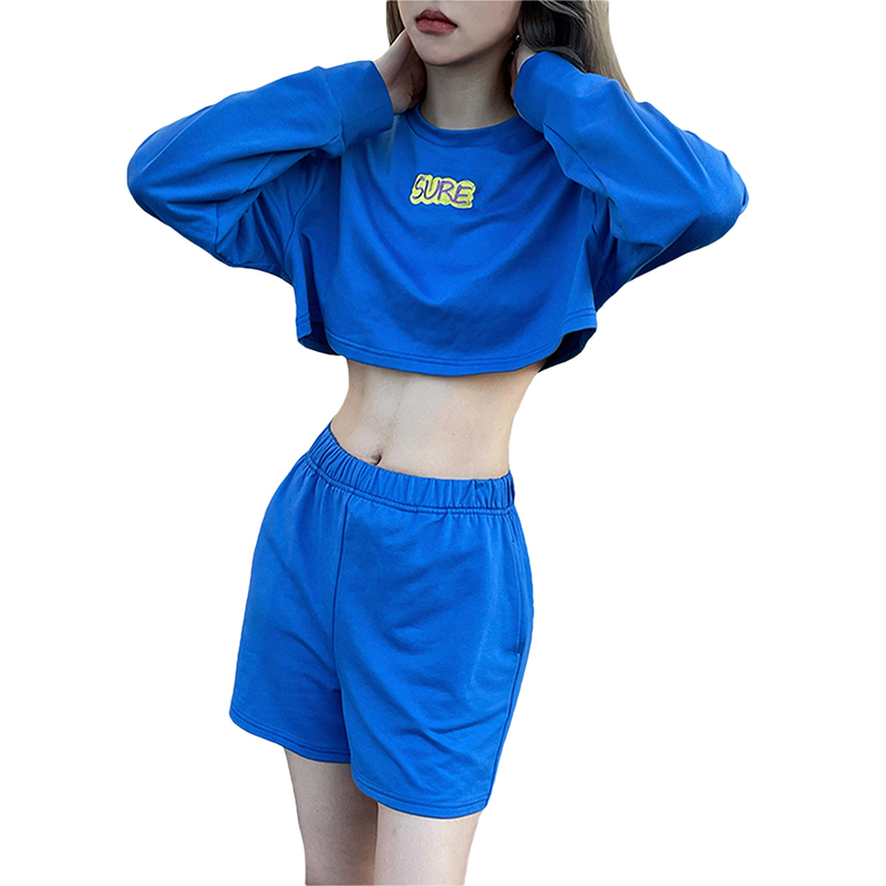 2Pcs Women Summer Tracksuit, Embroidery Long Sleeve Sweatshirt Matching Elastic Waist Shorts