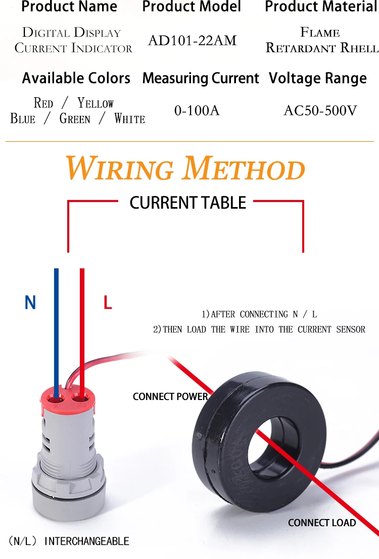 22 мм матовая поверхность цифровой дисплей круглый Амперметр измеритель тока Светодиодный светильник сигнала lndicator AD101-22AM 0-100A AC50-500V