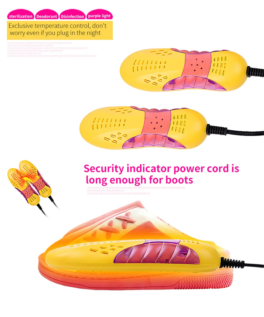 Существует обычная проблема для любителей спорта, что после упражнений обувь легко влажная. В дождливой зоне обувь легко моется из-за скучного дождя. Наша сушилка для обуви поможет вам решить вышеуказанные проблемы. Сушилка для обуви отводит влагу внутри обуви и с устройством для стерилизации фиолетовой лампы устраняет рост бактерий. Продукт отлично подходит для домашней повседневной жизни. Стоит купить!
