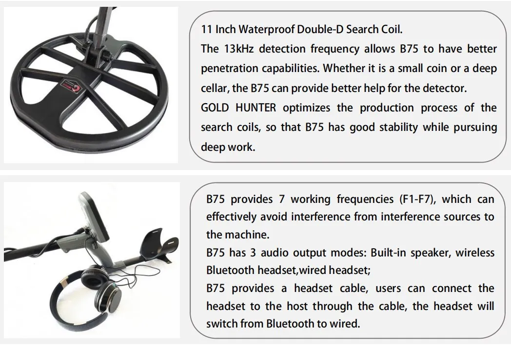 Металлоискатель Gold Hunter B75 поставляется с беспроводным/проводным фоном Heaphones (стандартная 11 "Двойная D катушка с легким s-телескопическим стержнем ручки)