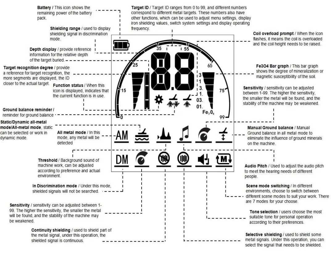13. Точка отсчета:Функция Pinpoint для дальнейшего подтверждения точного местоположения целевого металла, чтобы минимизировать раскопки. Перед использованием режима Pinpoint, вам нужно сделать операции баланса земли, чтобы устранить влияние земли.