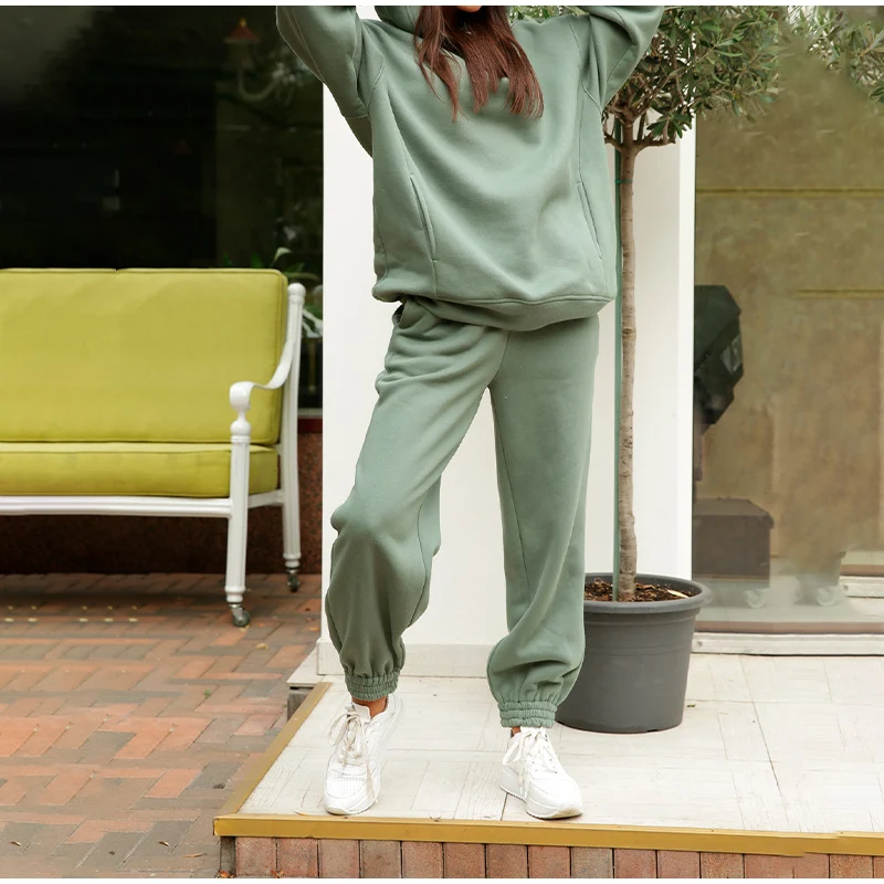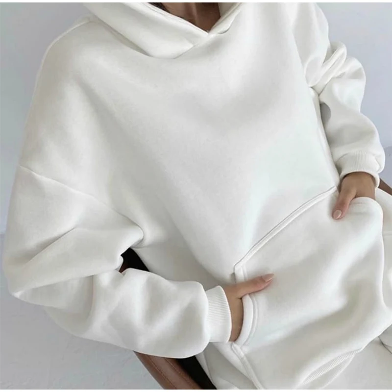 Женский спортивный костюм большого размера, повседневный однотонный комплект из двух предметов, спортивные костюмы с капюшоном, осенне-зимние теплые толстовки с капюшоном, флисовые толстовки