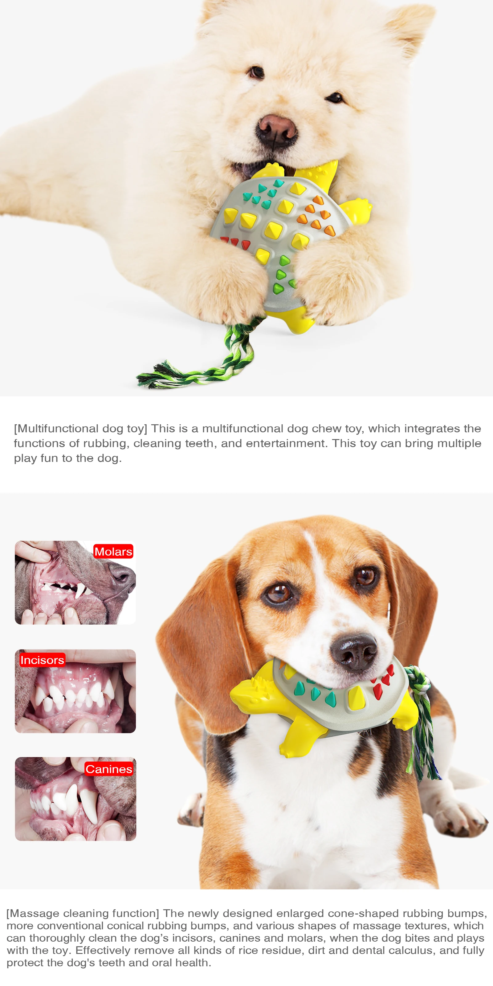 Недавно разработанные увеличенные шишки в форме конуса, более обычные конические шишки и различные формы массажной текстуры, которые могут тщательно очистить резцы собаки, клыки и моляры, когда собака кусается и играет с игрушкой. Эффективно удаляет все виды остатков риса, грязи и зубного камня и полностью защищает зубы собаки и здоровье orall.