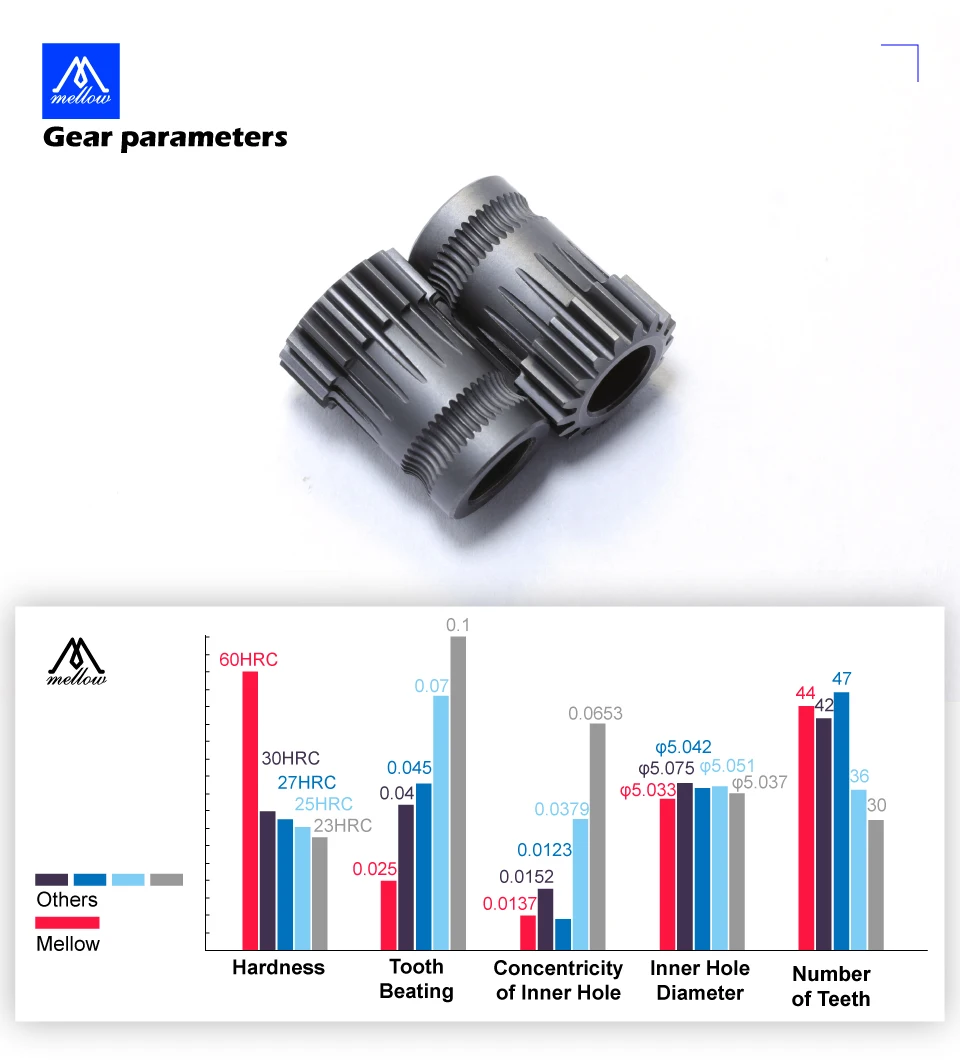 3. Наши шестерни производятся японскими высокоточными станками с ЧПУ. После различных производственных процессов окончательная трансформация закалки затвердеет сталь, а поверхность является нано покрытием, так что шестерни более красивы, сохраняя твердость. Высокоточная обработка также помогает распределению зубов. Однородность делает нить более стабильной и точной во время процесса экструзии, уменьшая поломку нити и засорение сопла, создавая резкое отличие от недорогих передач.