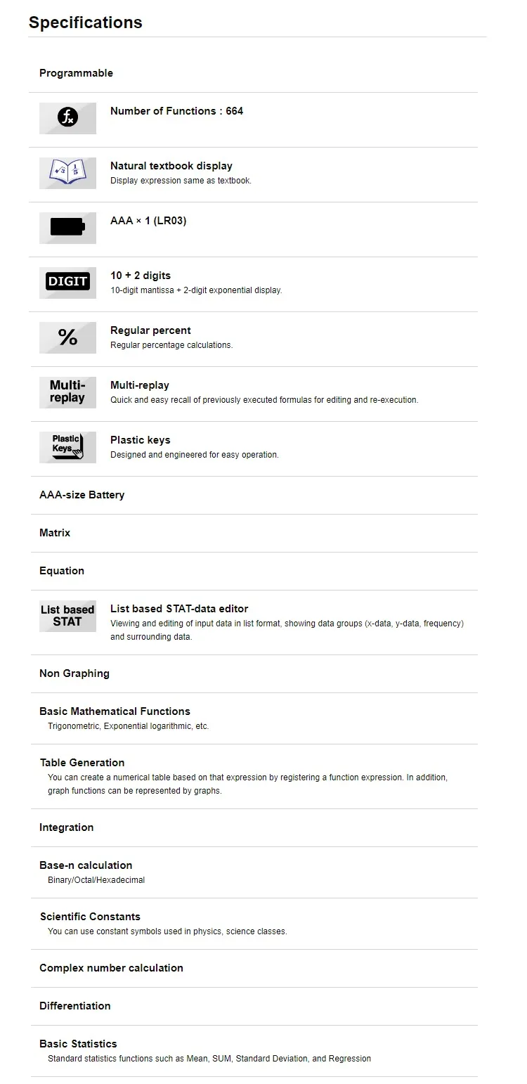 - К вашим услугам 10 цифр коэффициент + 2 Коэффициент дисплей благодаря своей высокой разрешающей способностью точечная матрица широкий экран, который позволяет с легкостью создавать красивый графики. Калькулятор на экране с 664 функциями, возможно отображение выражений в виде учебника на экране.