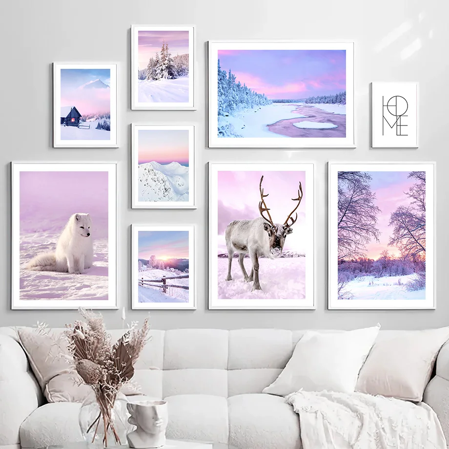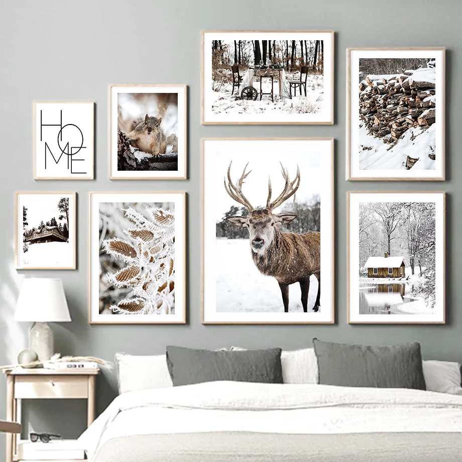Зимний снег Солнечный свет лес олень цветы Настенная живопись на холсте скандинавские плакаты и принты настенные картины для декора гостиной