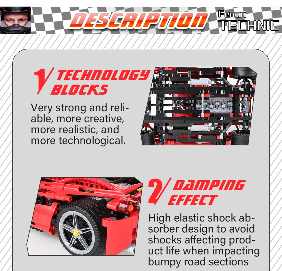 1. Профессиональная организация: le modéle de course se compose de 1359 piéces faciles à démonter/à installer-afin que vos enfants puissent s'amuser sans s'ennuyer. Plastique ABS de haute qualité avec couleurs classiques noir et rouge pour rendre votre voiture plus cool