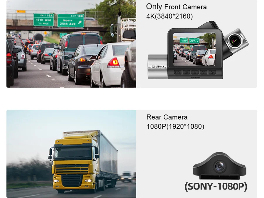 Видеорегистратор использует двойной режим камеры, спереди 2K (2560*1440) + сзади 1080P