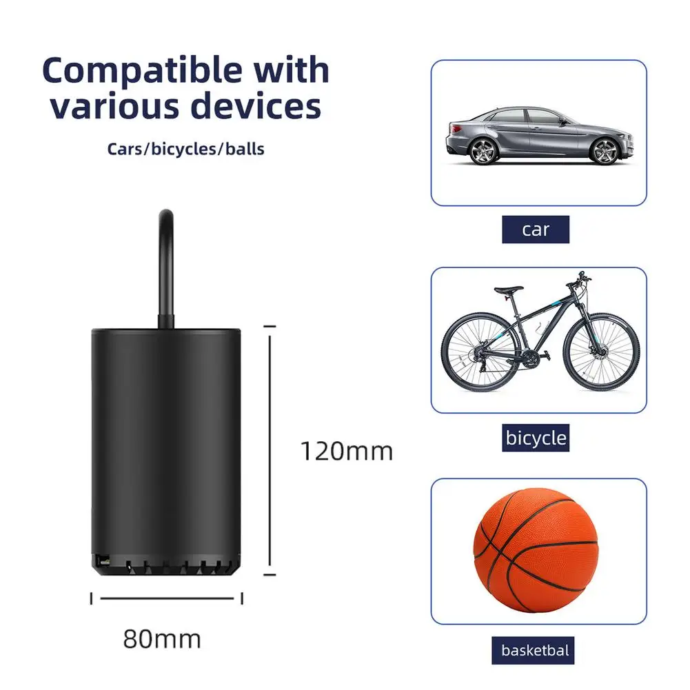 1. С беспроводным портативным дизайном, совместимым с несколькими насадками, он может надувать обычные велосипедные шины, футбольные мячи, автомобильные шины, шины для мотоциклов и т. д.