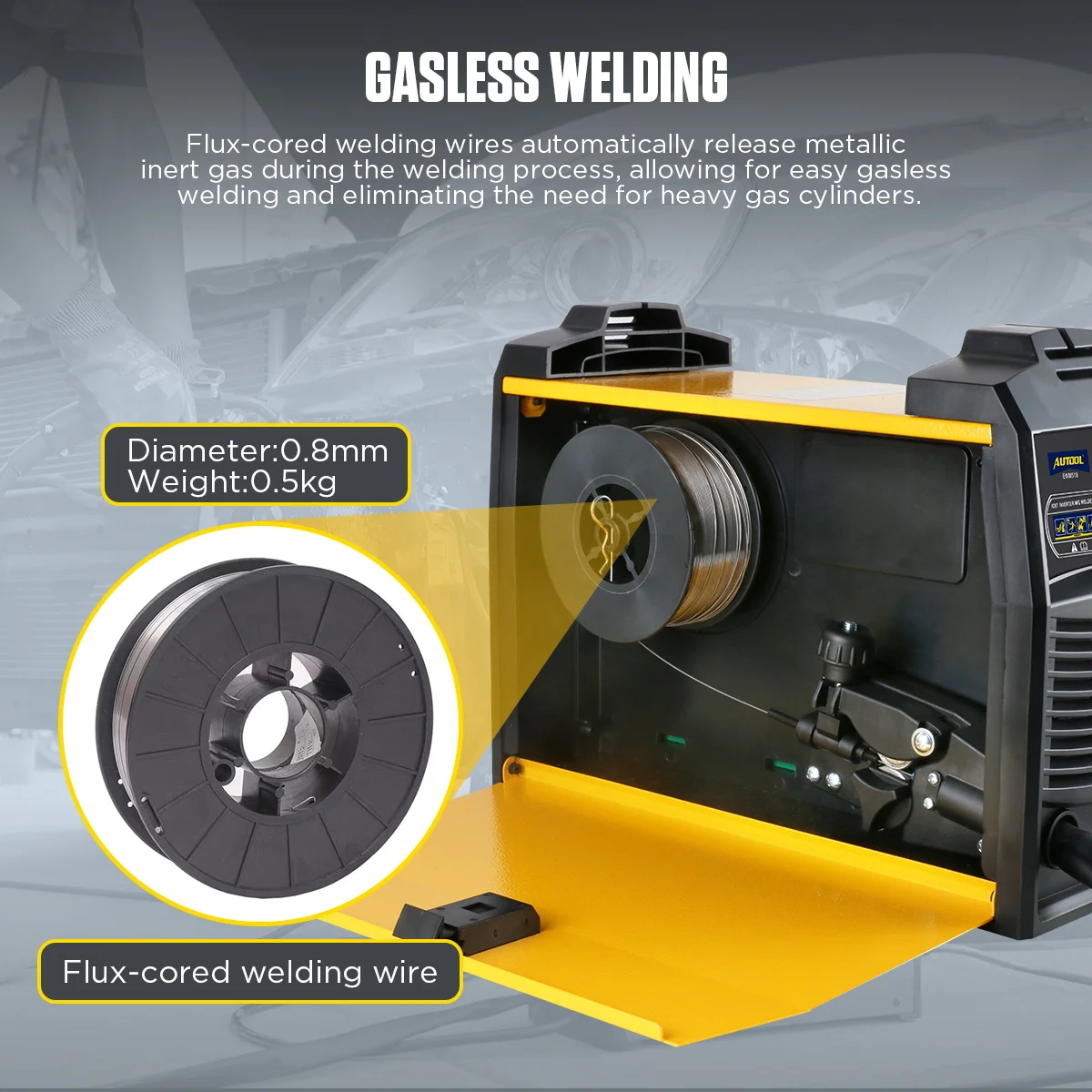 1.[Безгазосная Сварка]: сварочный аппарат AUTOOL M518 ARC MIG с инвертором приспосабливается к сварочной проволоке с Флюсом, которая автоматически выделяет Металл инертным газом во время сварочного процесса, так что безвоздушная сварка может быть легко реализована, устранение потребности в тяжелых газовых цилиндрах.
