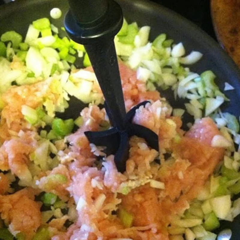Измельчитель мяса может хорошо разложить мясо, не повреждая поверхность антипригарной сковороды.