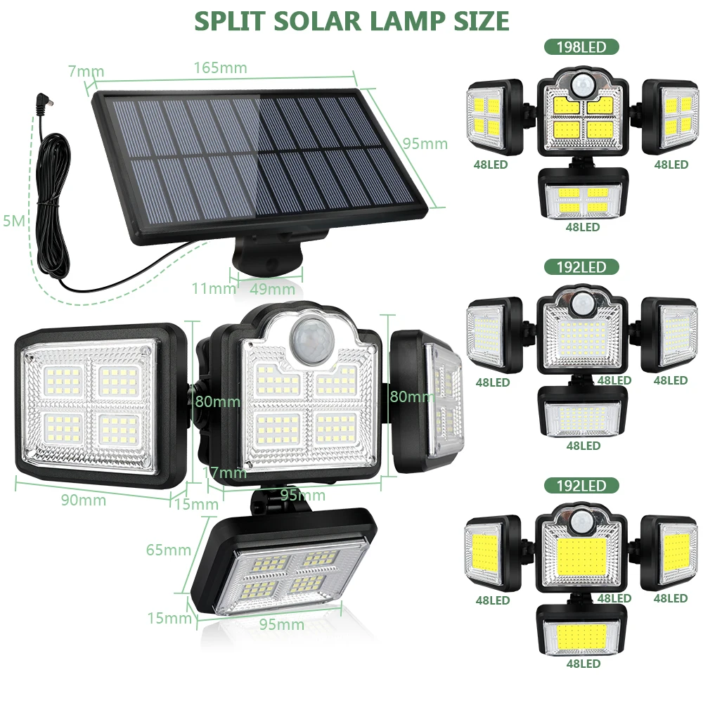 【360° Wide Angle】4 adjustable heads design offers 360°wide lighting angle. With sensitive PIR motion inductor, our solar security light can detect motion up to 3-7m, covering the area of 120 degree wild angle.The solar motion lights can be a outdoor security light to alert you when someone gets close, and better secure your property. The 5m long cable allows you to install the solar panel to outdoor sunny place and put the light panel indoors for house lighting.