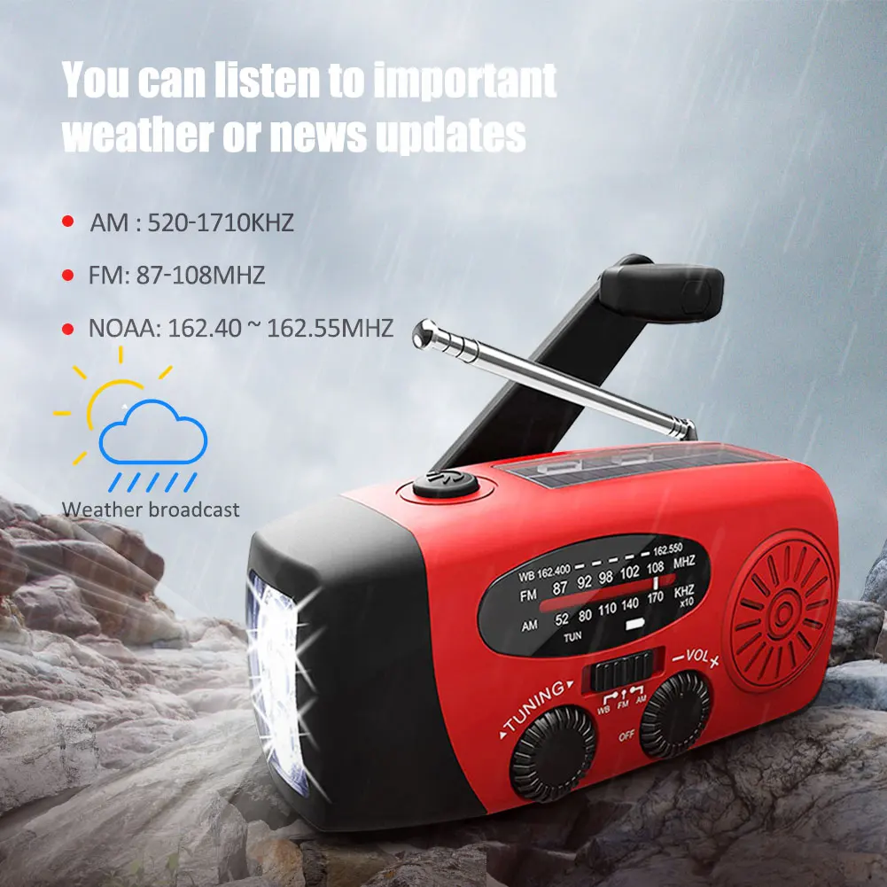 【USB, солнечная и ручная зарядка 】: нет электричества? Не беспокойтесь. Благодаря 3 способам зарядки перезаряжаемое радио всегда готово к использованию! Мощный аккумулятор емкостью 1000 мА · ч можно заряжать через usb-кабель, панель солнечных батарей или рукоятку.