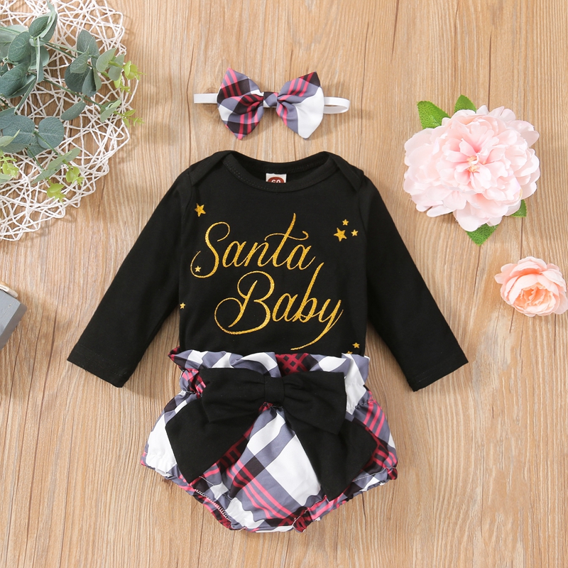 На возраст от 0 до 24 месяцев Санта-Клауса детский, для новорожденных, для девочек с длинным рукавом; Детский хлопковый облегающий топ в клетку с галстуком-бабочкой Кружевные шорты и повязка на голову, 3 предмета, комплект детской одежды