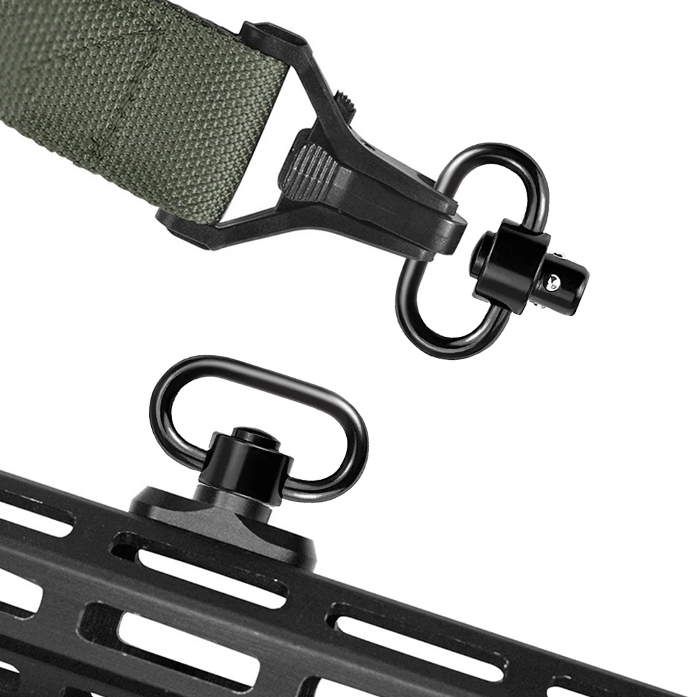 Newly upgraded solid swivel: made of solid steel, crafted to be completely solid and reliable when locking or pulling up the sling. The swivel can hold up to 220 lbs (approx. 99.8 kg) and can be securely attached to a 2-point qd hanger.