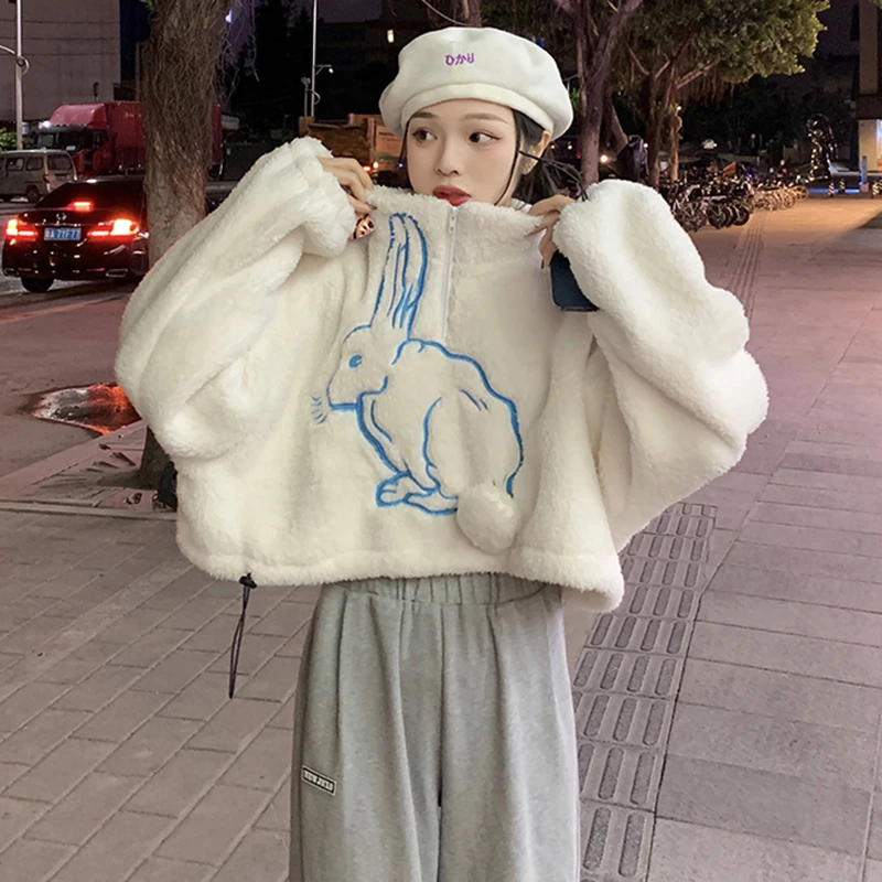 Модный теплый плюшевый свитер для женщин, пуловер с длинными рукавами, свободный джемпер, верхняя одежда белого цвета, топы на молнии с воротником-стойкой, новинка FC1678