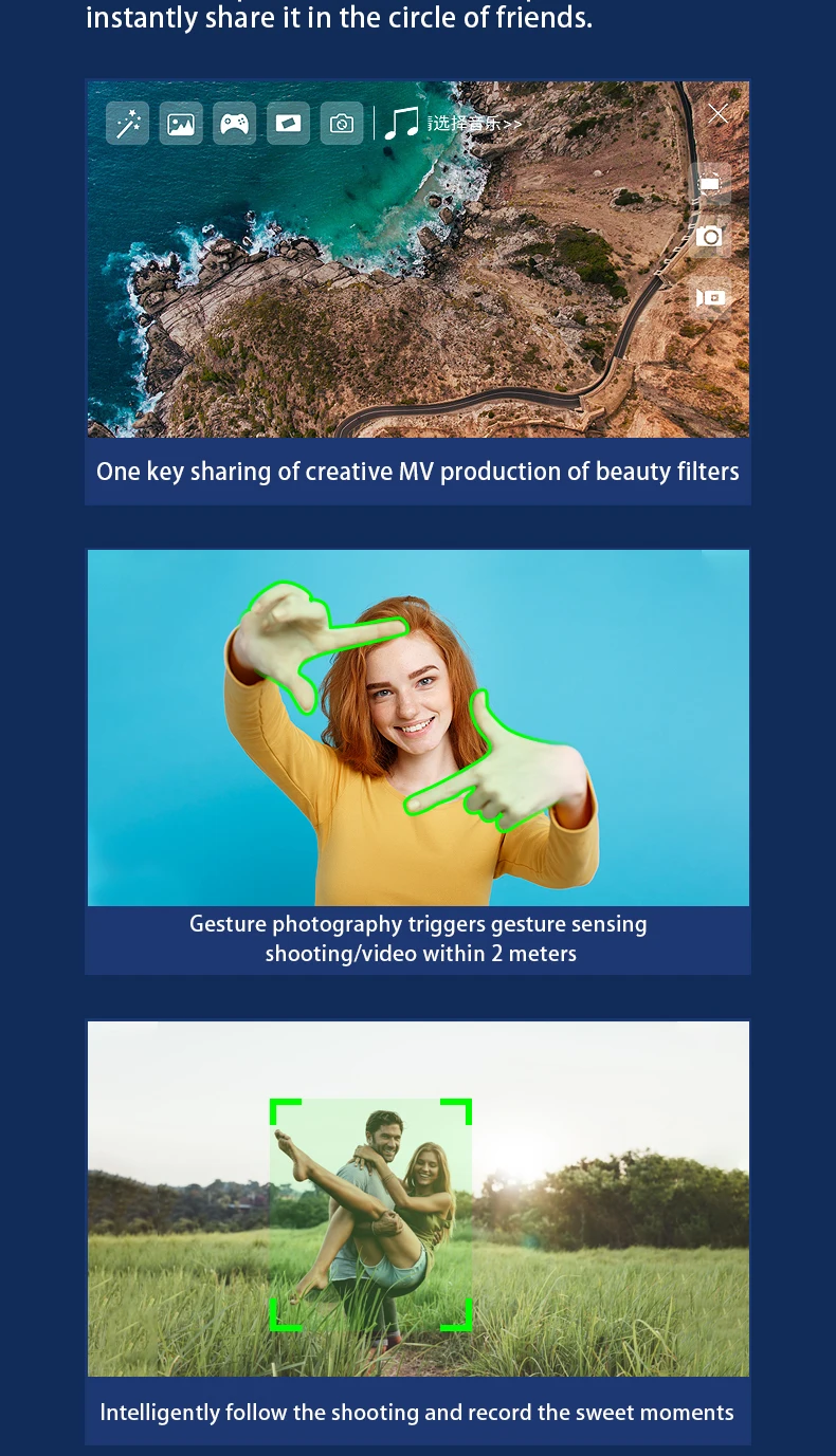 3. Распознавание жестов: когда вы смотрите на камеру дрона на расстоянии 1-3 м и делаете жесты, она кликнет на ваше изображение. Самолет умно распознает жесты и мгновенно превратит ваше счастливое время в вечную память.
