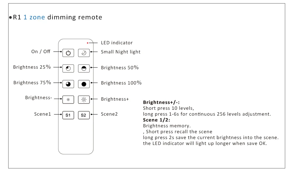 ● Длинный толчок (1-6 с): непрерывная регулировка яркости 256 уровней.