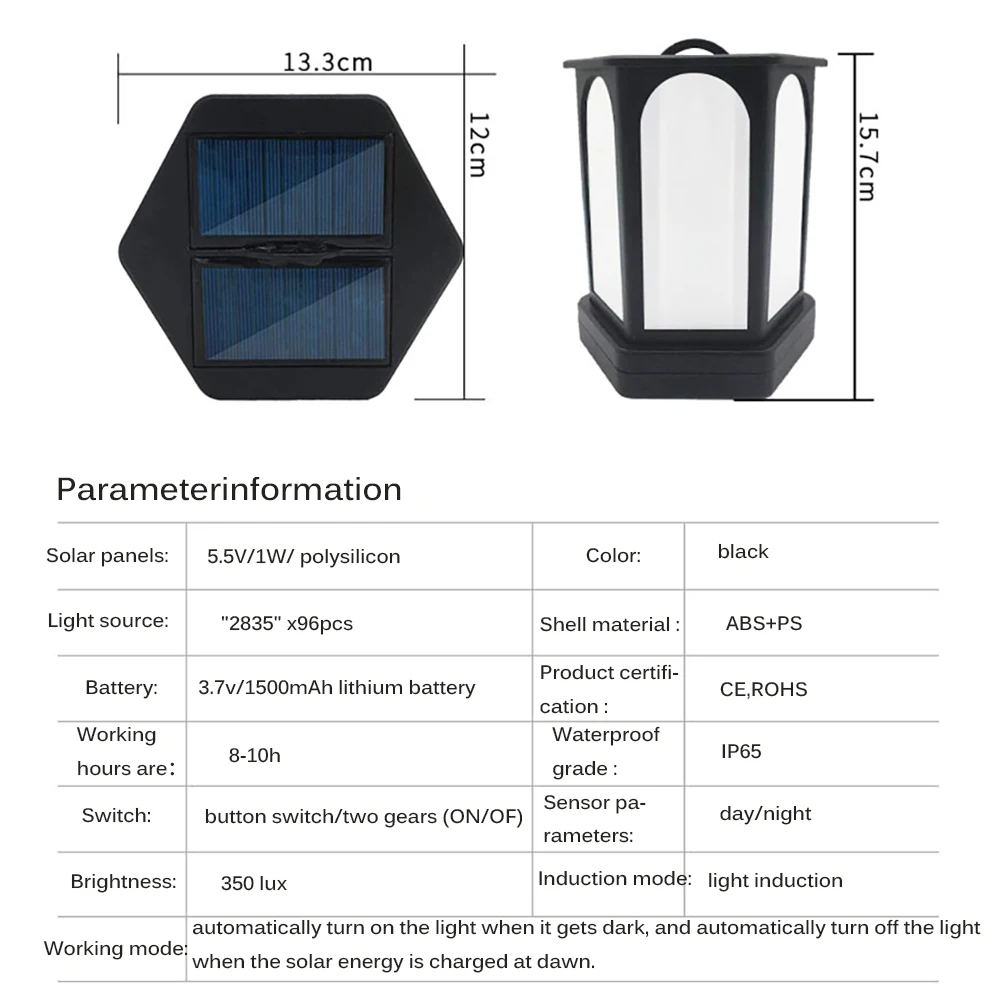Светильник пламени питается от солнечной энергии, энергосбережения и охраны окружающей среды. Он автоматически загорается в темноте, и солнечная зарядка автоматически выключает свет. Скорость зарядки на солнечной батарее из поликристаллического кремния является быстрой и эффективной.