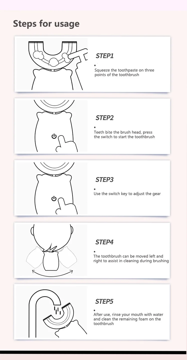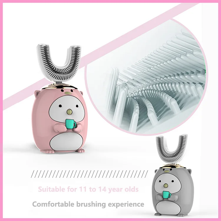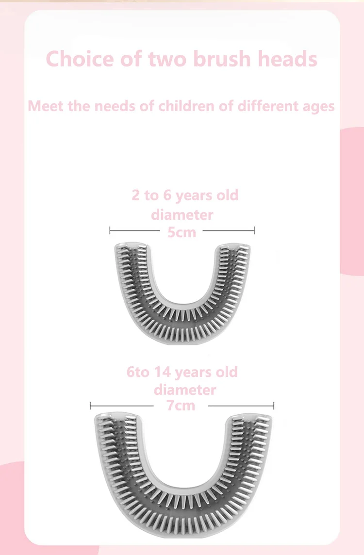 1. Детская электрическая зубная щетка, нанесенная u-образной головкой, дизайн пищевого специального мягкого силиконового материала и конструкция для обертывания зубов на 360 °, ваша зубная щетка может массировать ваши десны, и каждое использование принесет ваш рот быстрый и удобный опыт.