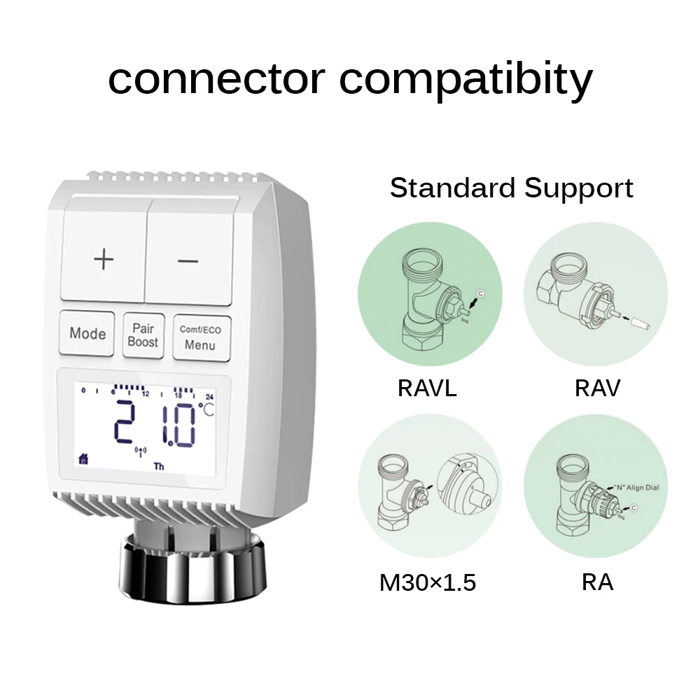 1. Термостат привода радиатора Smart Tuya ZigBee: Новый мини-дизайн с простым и прозрачным ЖК-дисплеем и светодиодным дисплеем на корпусе, термостат радиатора с ЖК-цифровым дисплеем и двумя секциями аккумуляторов AA, который является специальным клапаном, использующим вместе с нагревательным радиатором. Искусственно устанавливаемая температура в помещении, В основном используется в напольной системе отопления для контроля закрытия и открытия трубы 2MQTT установки доступны.