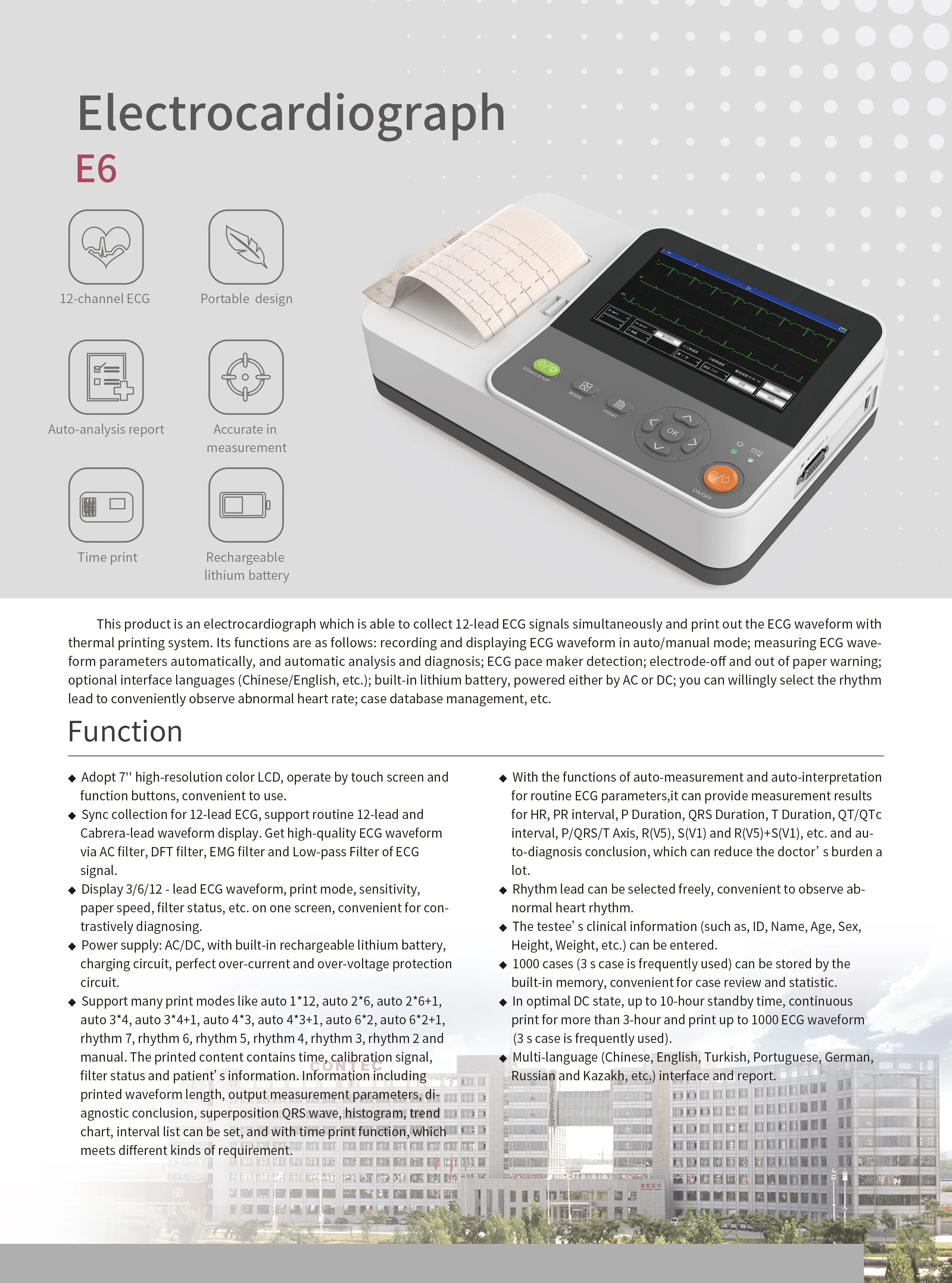 Contec Electrocardiograph E6 12-Lead ECG Time Print Powerful data management Auto-anaylsis Report